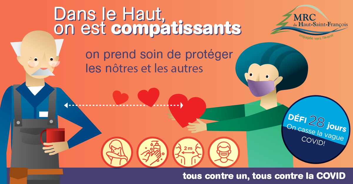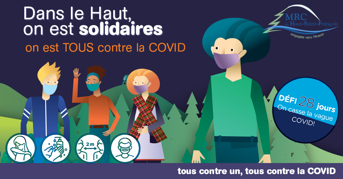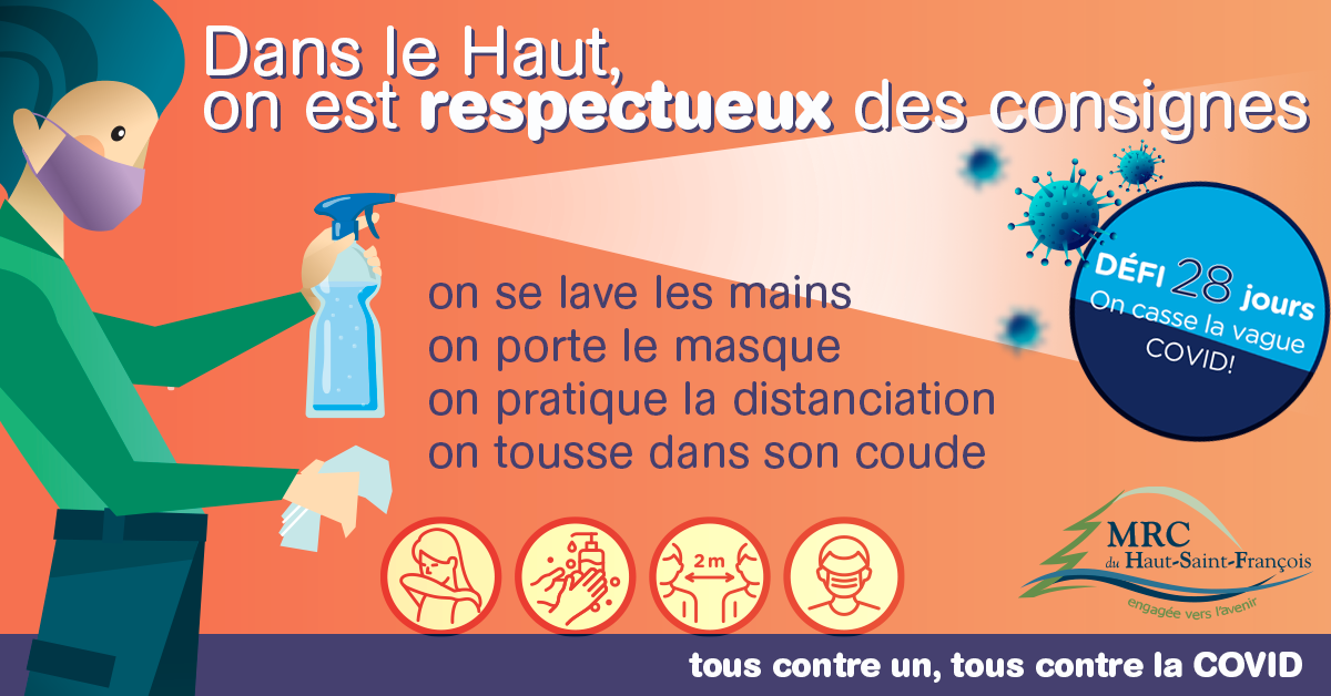 La Ville de East Angus se mobilise contre la COVID-19 pour les 28 prochains jours! À la maison, au travail ou à l’école, chaque personne doit poser cinq gestes importants : tousser dans son coude, se laver régulièrement les mains, garder la distance de 2 mètres en tout temps, couvrir son visage si la distance de 2 mètres n’est pas possible et limiter ses déplacements. Pas question d’une deuxième vague chez nous! On le fait pour soi, nos proches, nos amis, nos collègues, nos voisins. On le fait pour retrouver une vie normale le plus vite possible.