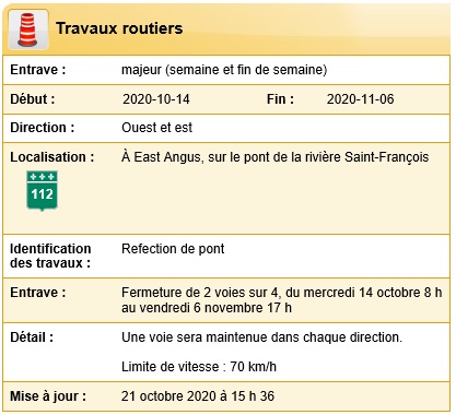 Pour information, voici une modification de l’avis d’entraves concernant la route 112 à East Angus.