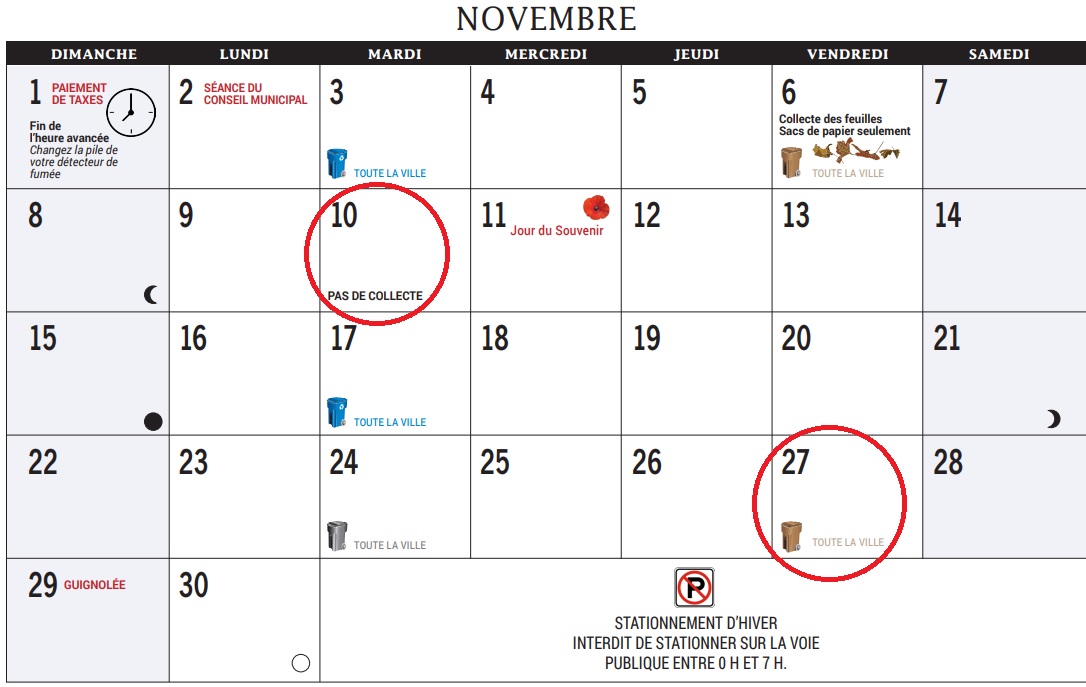 Prenez note du début de l’horaire hivernal des collectes des déchets et du compost tel qu’indiqué au calendrier.