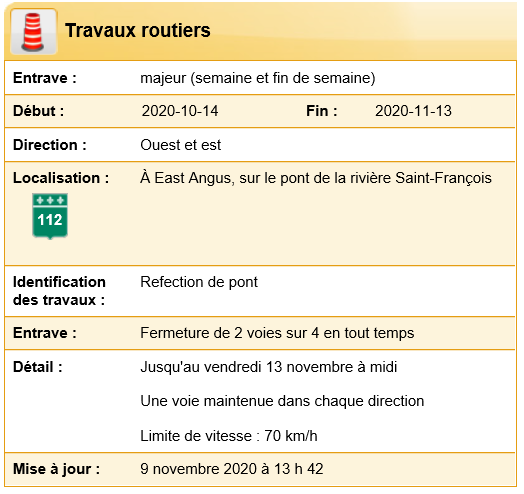 Pour information, voici une modification de l’avis d’entraves concernant la route 112 à East Angus.
