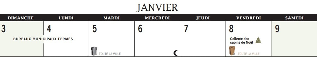 Veuillez prendre note de la collecte des ordures (bac noir) demain mardi 5 janvier. De plus, la collecte des sapins naturels et du compost (bac brun) aura lieu ce vendredi 8 janvier 2021.