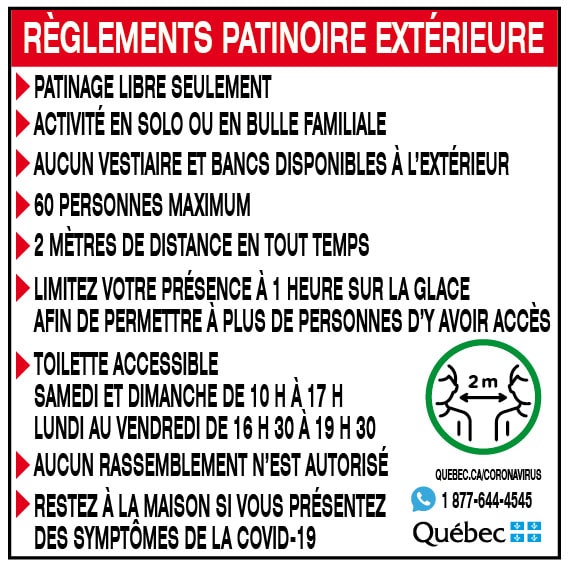 Nous demandons aux patineuses et patineurs de quitter les lieux à compter de 19 h 30 afin de respecter les consignes gouvernementales actuelles.