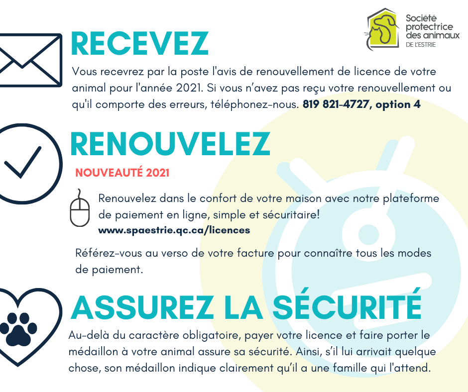 D’ici la fin du mois de janvier, tous les gardiens d’animaux de compagnie déjà enregistrés auprès de la SPA de l’Estrie recevront par la poste leur avis de renouvellement.