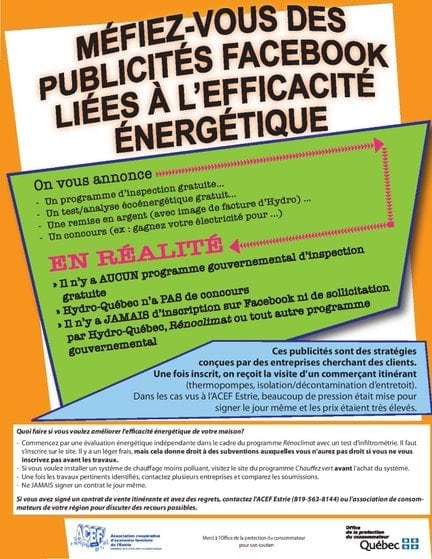 On voit ces temps-ci sur Facebook plusieurs publicités liées à l’EFFICACITÉ ÉNERGÉTIQUE : ‘obtenez votre subvention de 3 500 $’, ‘inspection gratuite de votre entretoit’, concours ‘Gagnez votre isolation gratuite’, etc. ATTENTION! Les concours ou inspections gratuites sont des stratégies de commerçants itinérants pour obtenir vos coordonnées et un rendez-vous à votre domicile. Et les programmes de subvention annoncés sont souvent douteux. Avec le déconfinement, nous nous attendons aussi à une reprise de la sollicitation téléphonique.