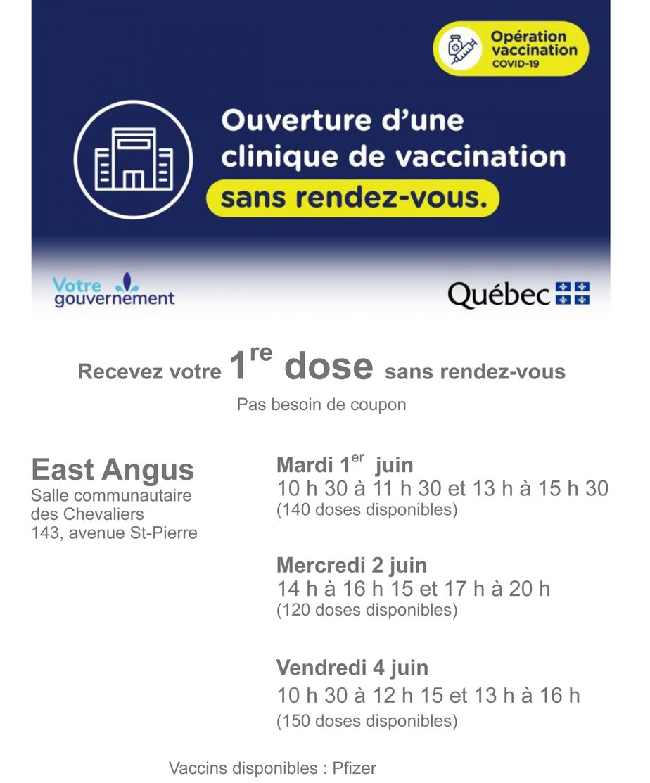 Accès à la vaccination sans rendez-vous à East Angus aujourd’hui, mercredi et vendredi ! Agrandir l'image Accès à la vaccination sans rendez-vous à East Angus aujourd’hui, mercredi et vendredi ! East Angus2021-06-01T12:05:02-04:001 juin 2021|Actualités| Partager sur les réseaux FacebookTwitterCourriel