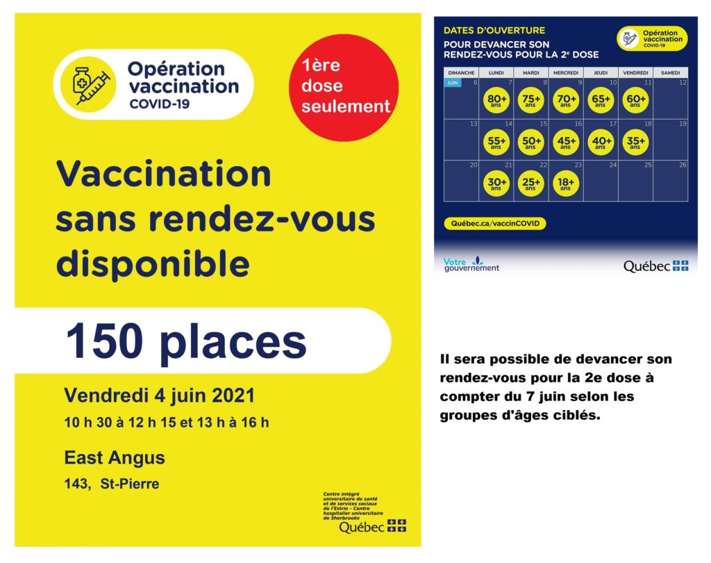 Aujourd’hui vendredi 4 juin – Clinique de vaccination sans rendez-vous seulement pour la 1ère dose Agrandir l'image Important – Clinique de vaccination sans rendez-vous seulement pour la 1ère dose Aujourd’hui – Vendredi 4 juin de 10 h 30 à 12 h 15 et de 13 h à 16 h Il sera possible de devancer son rendez-vous pour la 2e dose à compter du 7 juin selon les groupes d’âges ciblés. East Angus2021-06-04T06:45:16-04:004 juin 2021|Actualités| Partager sur les réseaux FacebookTwitterCourriel