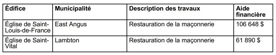 Cette aide financière permettra la réalisation de deux projets de restauration de maçonnerie. Un montant de 106 648 $ est destiné à l’église de Saint-Louis-de-France d’East Angus, qui est un immeuble patrimonial cité, tandis que 61 890 $ sont réservés à l’église de Saint-Vital de Lambton, qui est située dans un site patrimonial cité en vertu de la Loi sur le patrimoine culturel. La somme consentie aujourd’hui fait partie de l’enveloppe totale de 15 M$ du Programme visant la protection, la transmission et la mise en valeur du patrimoine culturel à caractère religieux, annoncée récemment par la ministre de la Culture et des Communications pour l’année 2021- 2022. Sur l’ensemble du territoire québécois, 73 projets seront réalisés grâce à ce montant. Rappelons que le Programme permet de financer jusqu’à 80 % des coûts des projets ayant préalablement fait l’objet d’un processus de sélection rigoureux du Conseil du patrimoine religieux