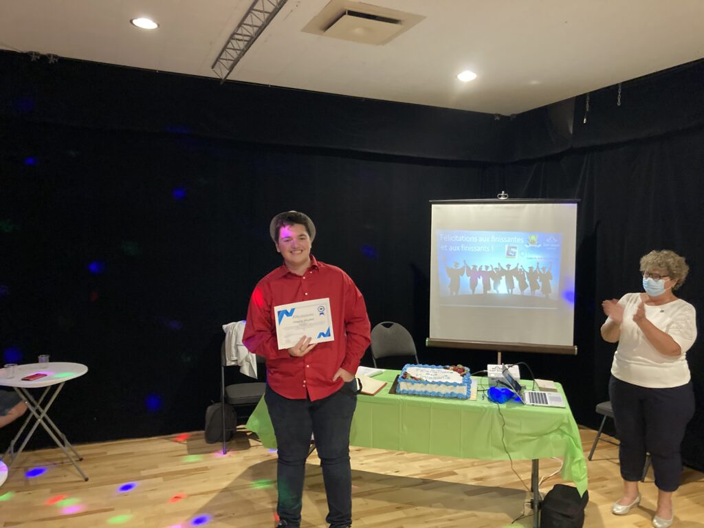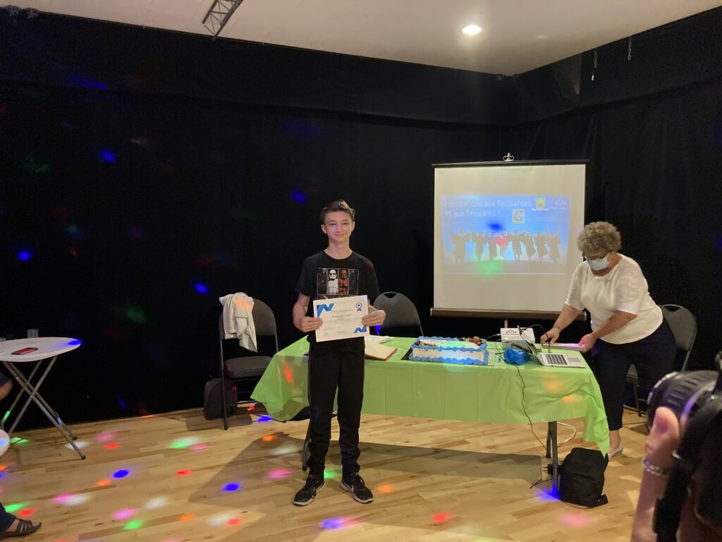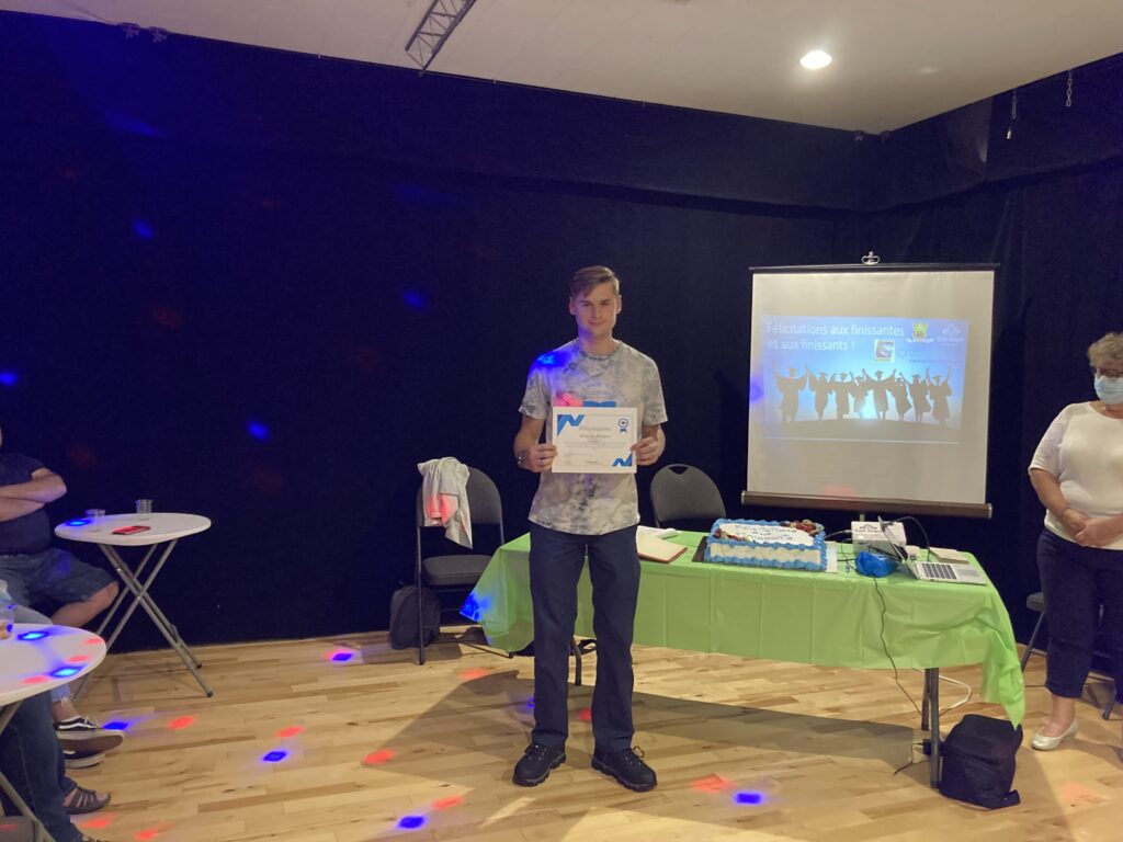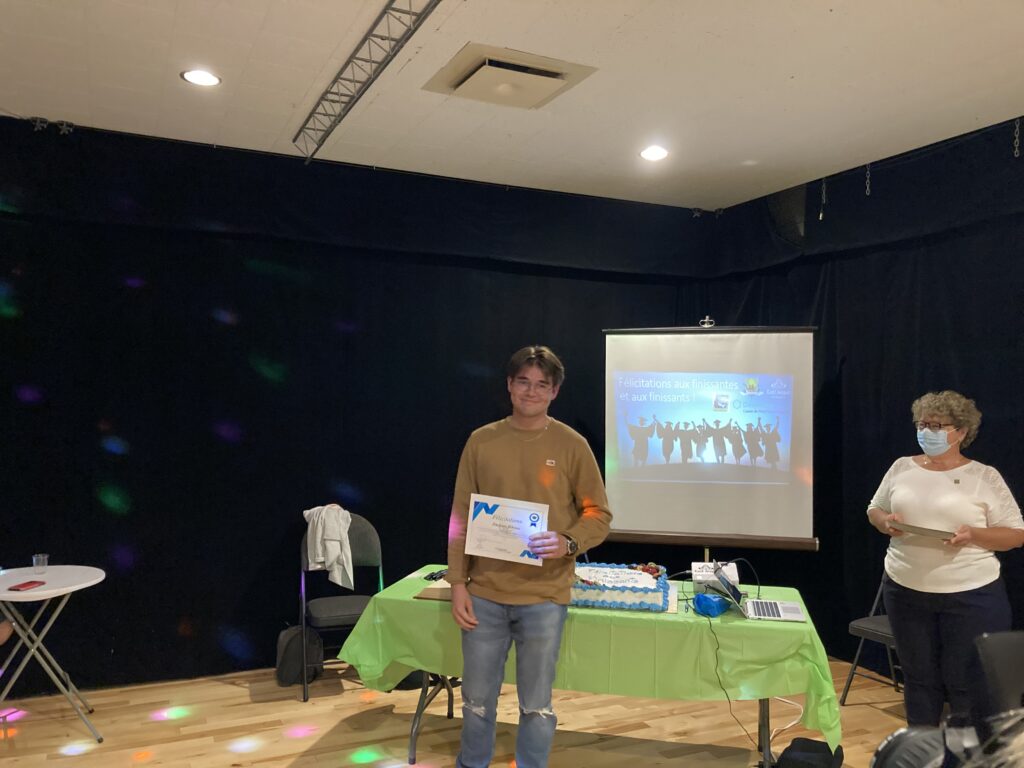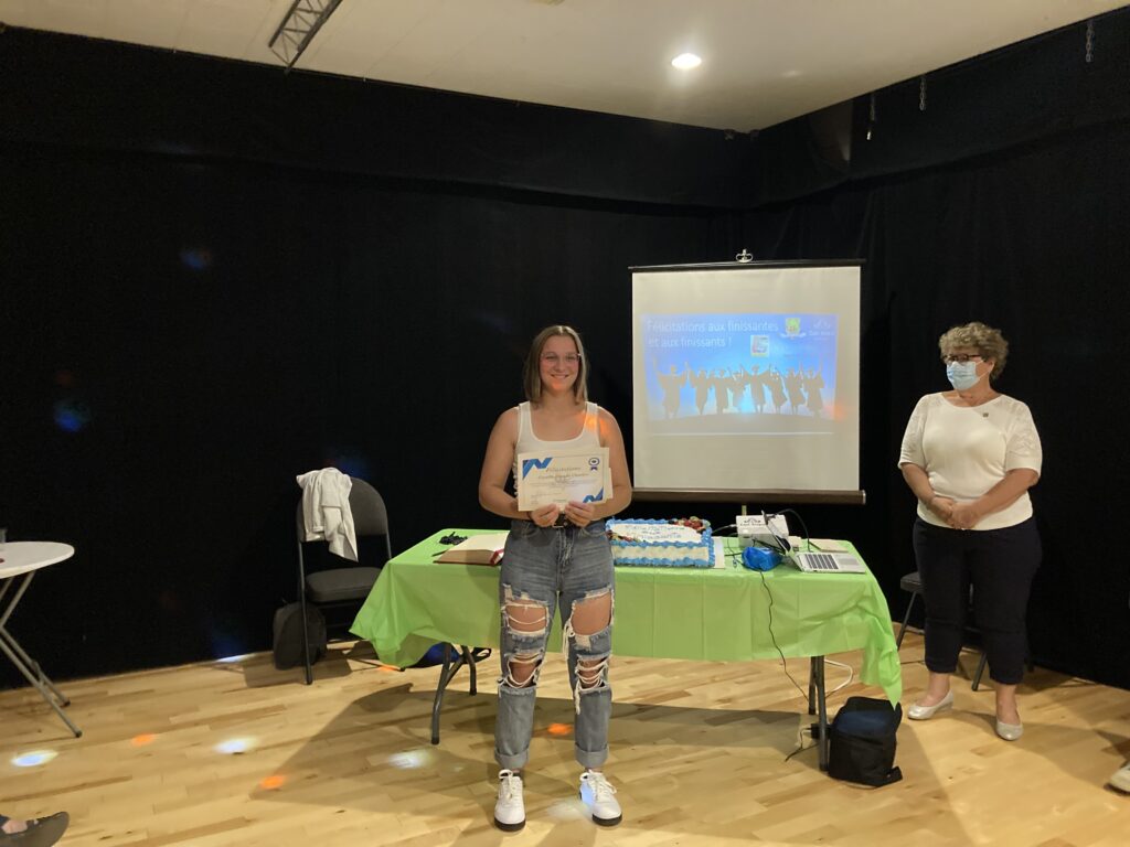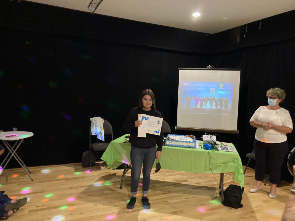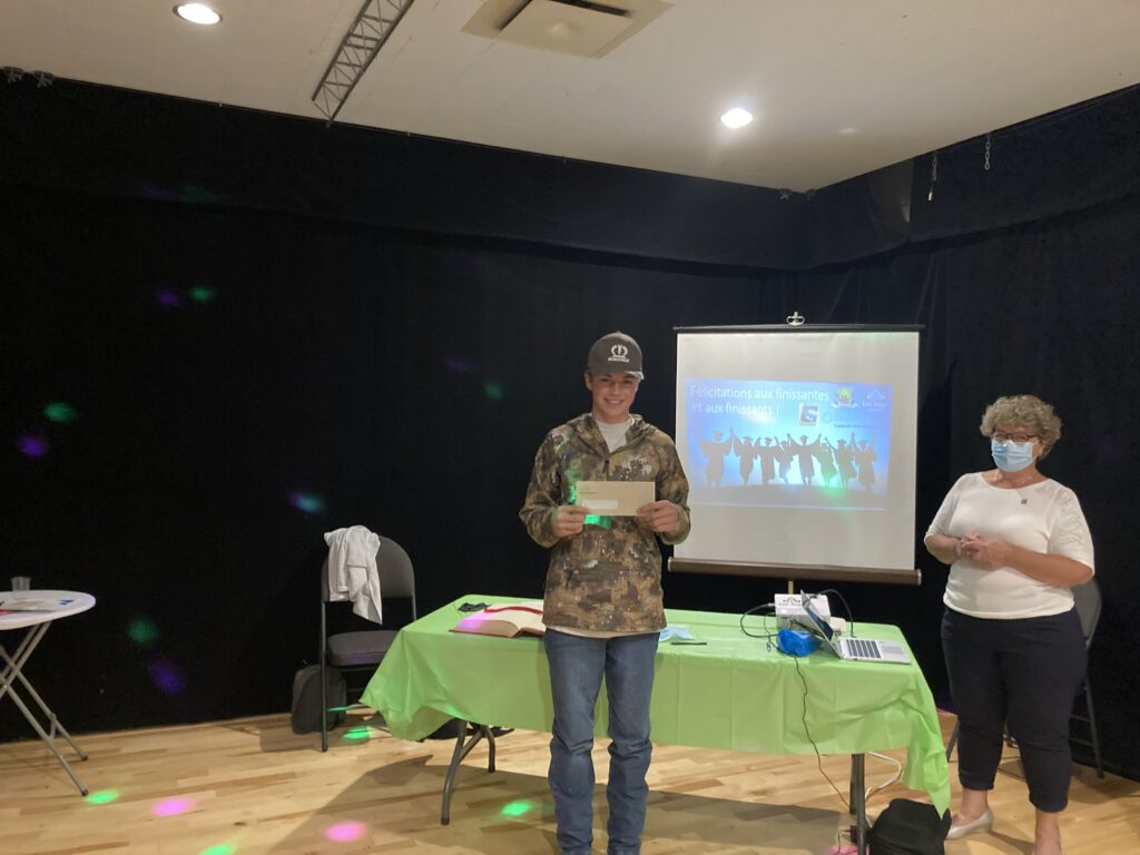 C’est ce mercredi 1er septembre 2021 au Centre culturel en présence des jeunes finissantes et finissants, parents, Mme Lyne Boulanger, mairesse de la Ville de East Angus, les membres du conseil municipal, M. Rémi Vachon, représentant de la Caisse Desjardins du Haut-Saint-François, M. Tommy Poulin, directeur de la Cité-école Louis-Saint-Laurent, mesdames Lyne Nadeau, Geneviève Lagueux, Rosalie Nadeau, enseignantes et Renée-Claude Leroux, organisatrice communautaire qu’avait lieu la soirée reconnaissance des finissants.