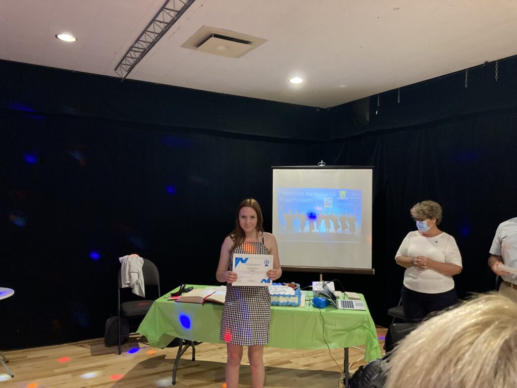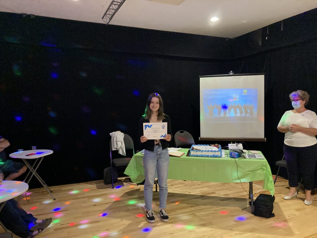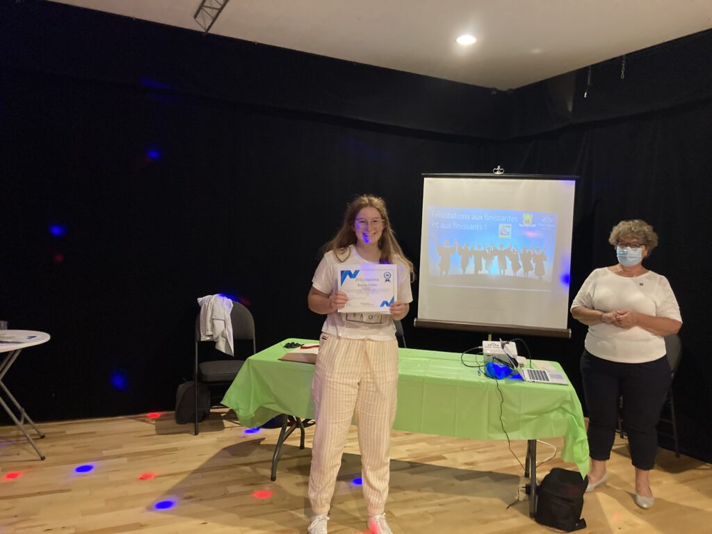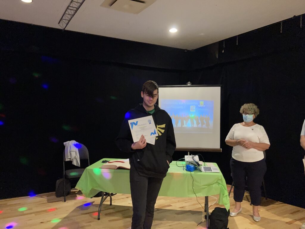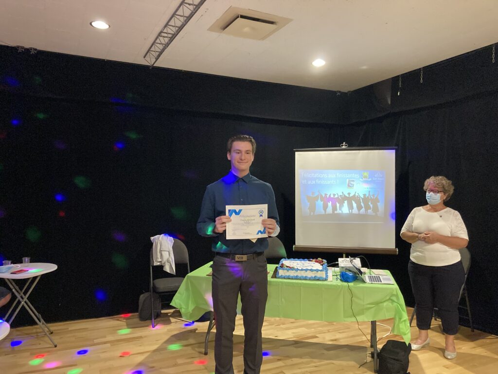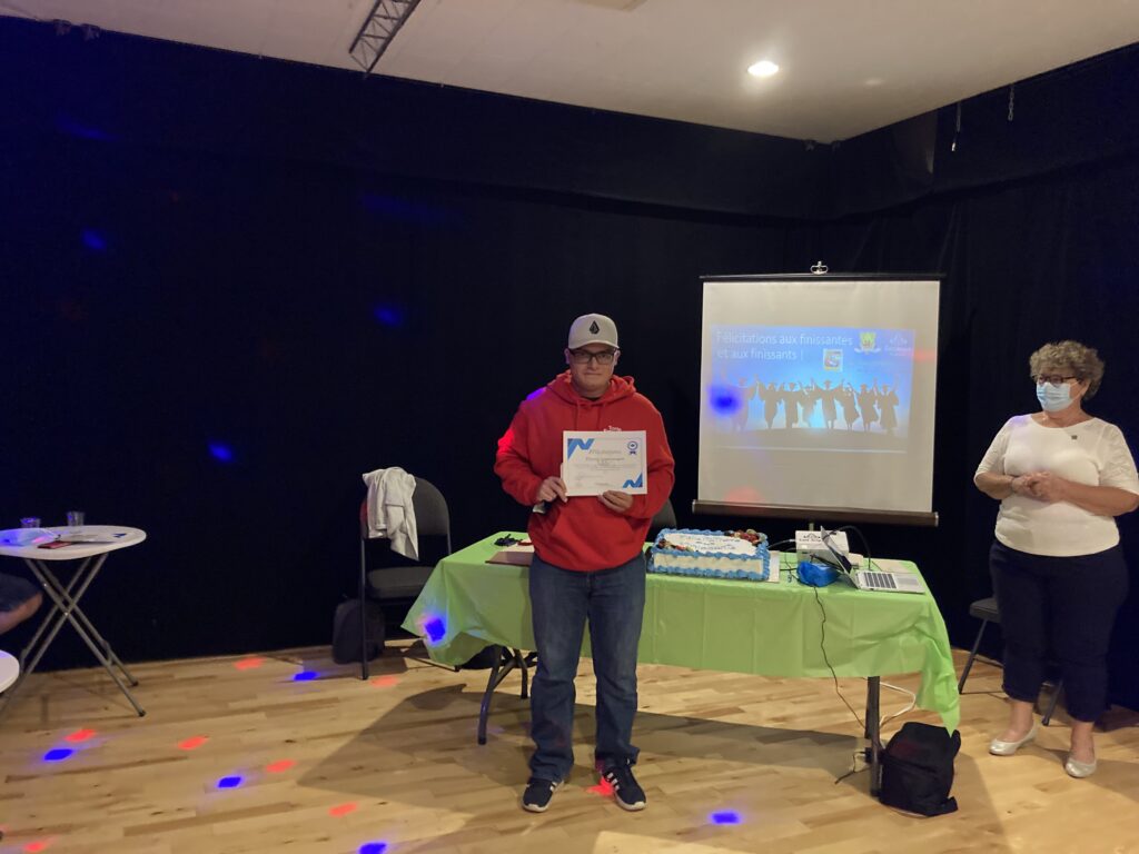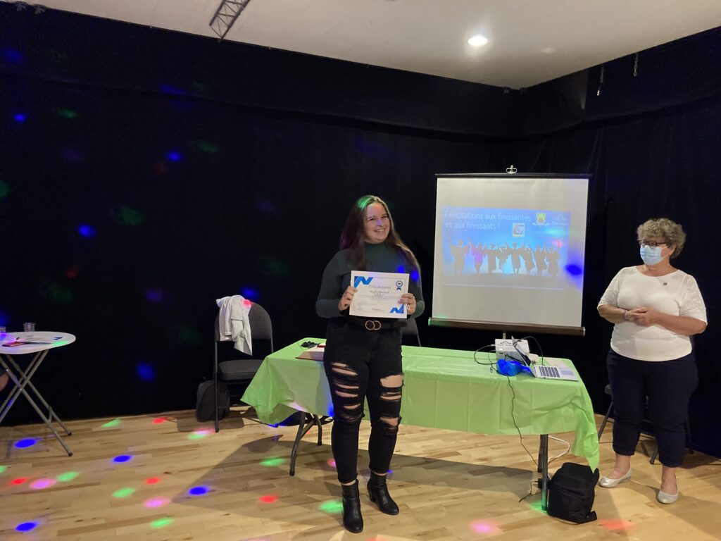 C’est ce mercredi 1er septembre 2021 au Centre culturel en présence des jeunes finissantes et finissants, parents, Mme Lyne Boulanger, mairesse de la Ville de East Angus, les membres du conseil municipal, M. Rémi Vachon, représentant de la Caisse Desjardins du Haut-Saint-François, M. Tommy Poulin, directeur de la Cité-école Louis-Saint-Laurent, mesdames Lyne Nadeau, Geneviève Lagueux, Rosalie Nadeau, enseignantes et Renée-Claude Leroux, organisatrice communautaire qu’avait lieu la soirée reconnaissance des finissants.