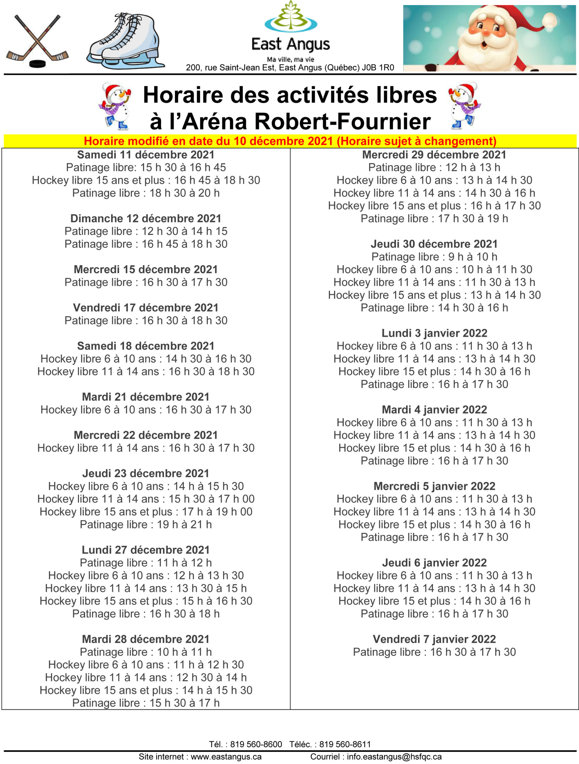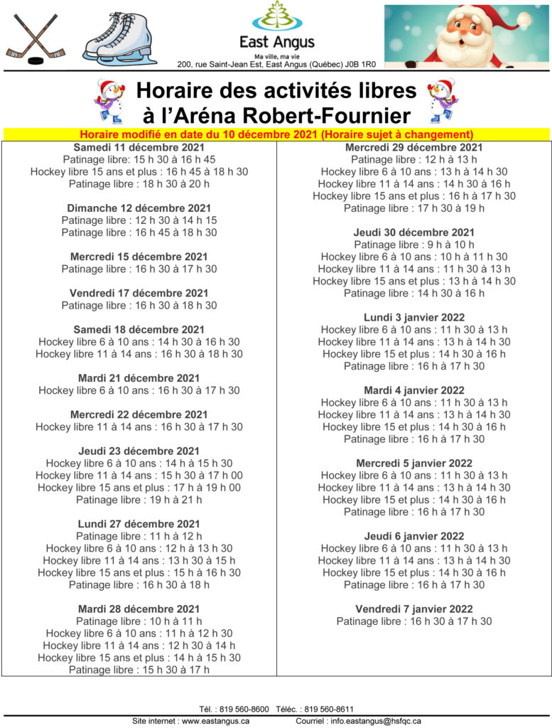 Horaire des activités libres à l’Aréna Robert-Fournier jusqu’au 7 janvier 2022.