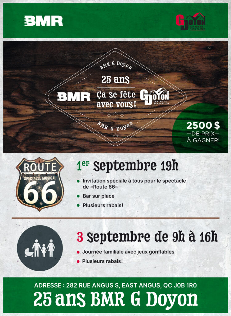 Venez fêter le 25e anniversaire du Centre de rénovation BMR Gilles Doyon de East Angus et de Sherbrooke ce jeudi 1er septembre à compter de 19 h au 282, rue Angus Sud, East Angus