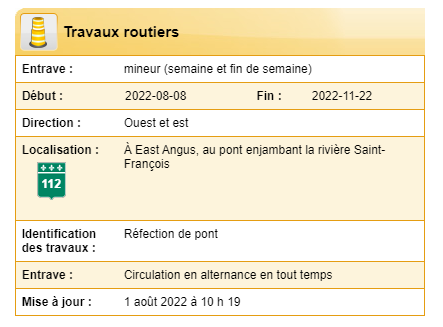 Ces travaux peuvent être modifiés en raison de contraintes opérationnelles ou des conditions météorologiques. Afin de connaître les entraves en cours, consultez Québec 511, un outil pratique pour planifier adéquatement vos déplacements.