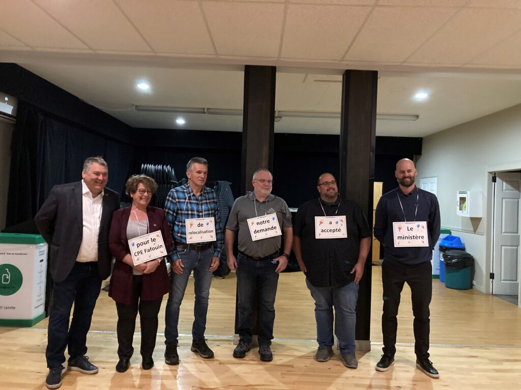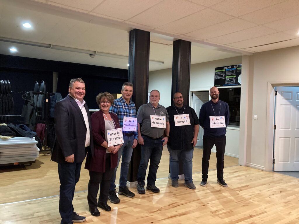 Ce soir, lundi 14 novembre 2022, le député M. François Jacques et les membres du conseil municipal étaient fiers de participer au Centre culturel de East Angus à la soirée de dévoilement au personnel de l’acceptation du projet de relocalisation pour un nouveau CPE (Centre de la petite enfance) Fafouin de 98 places (49 places existantes + 49 nouvelles places) qui sera situé sur la rue Lafontaine à East Angus.