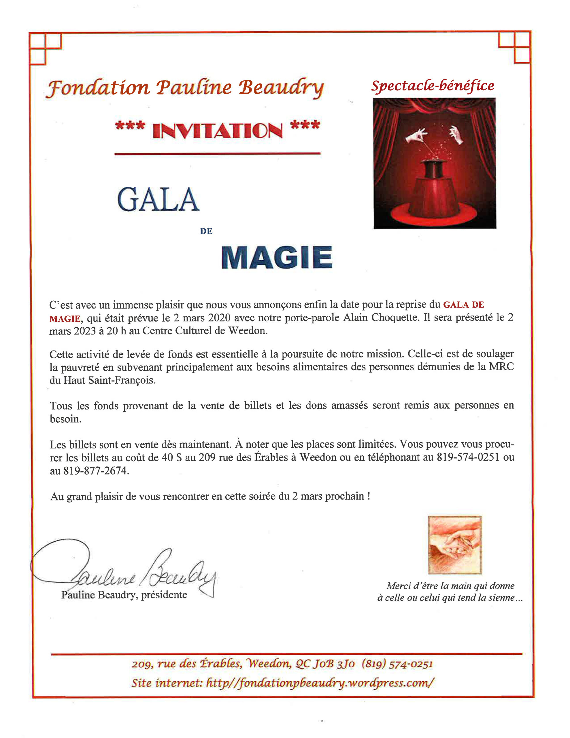 Gala de magie avec M. Alain Choquette Agrandir l'image Une invitation de la Fondation Pauline Beaudry 2 mars 2023 40 $ du billet 819 574-0251 819 877-2674 East Angus2023-01-27T14:21:47-05:0027 janvier 2023|Actualités| Partager sur les réseaux FacebookTwitterCourriel