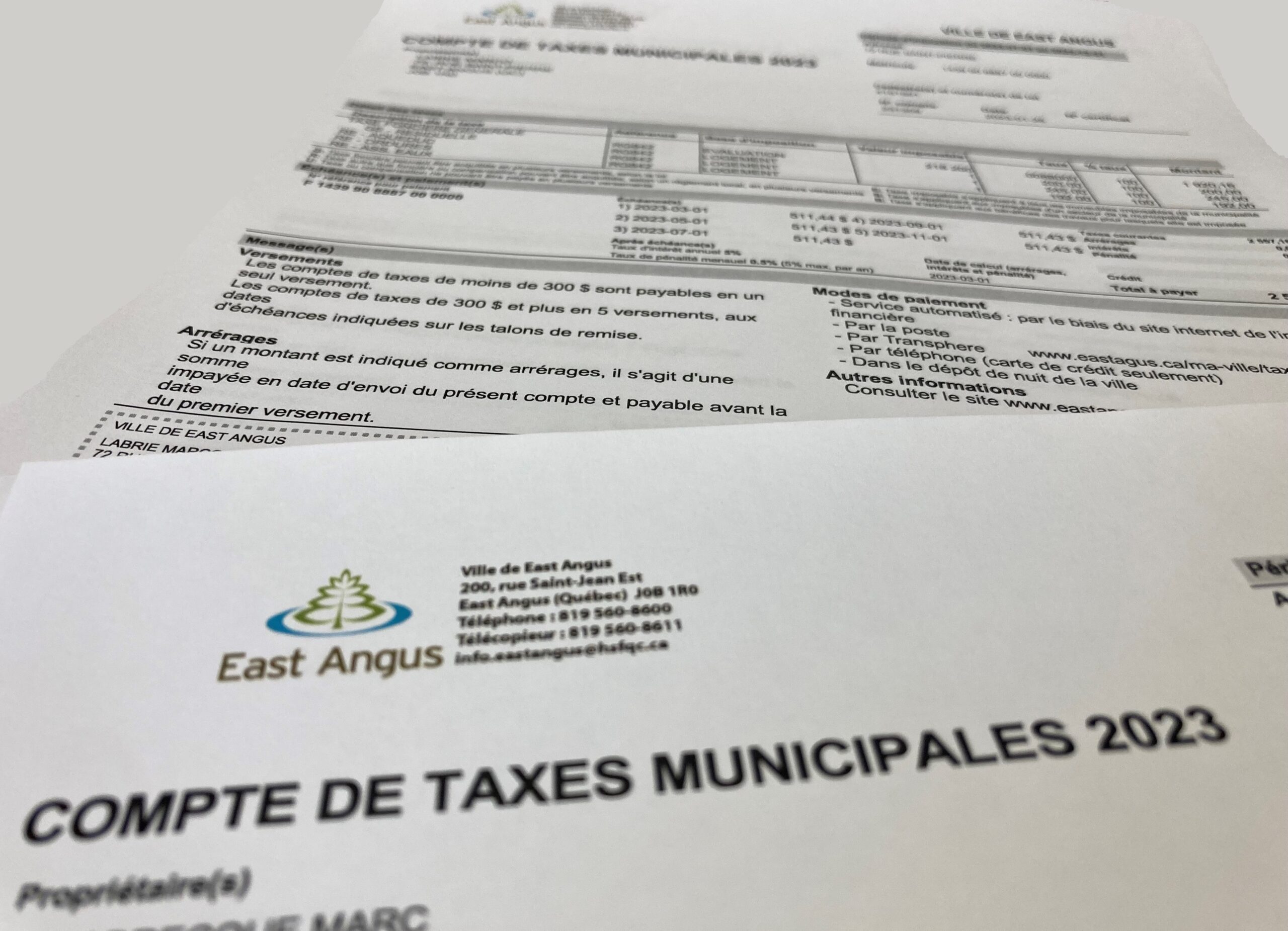 Si vous avez plus d’une propriété et/ou terrain à East Angus, veuillez vérifier puisque les différents comptes de taxes devraient normalement se retrouver dans le même envoi.