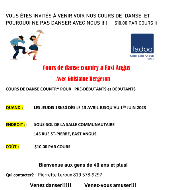 Cours de danse country à East Angus avec Ghislaine Bergeron Agrandir l'image East Angus2023-04-12T09:47:30-04:0012 avril 2023|Actualités| Partager sur les réseaux FacebookTwitterCourriel
