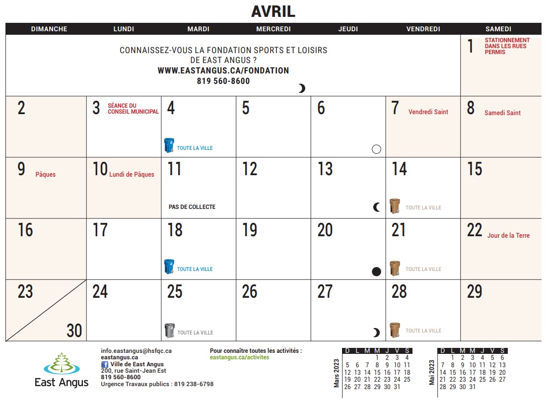 Prenez note des prochaines collectes à venir en avril. Malgré la neige tombée la nuit dernière, le stationnement dans la rue est autorisé la nuit à compter d’aujourd’hui samedi 1er avril 2023. Si d’autres précipitations étaient prévus, il est apprécié si vous pouvez éviter le stationnement dans la rue pour aider le travail des déneigeurs. De plus, la prochaine séance régulière du conseil municipal aura lieu ce lundi 3 avril à 19 h à l’Hôtel de ville de East Angus.