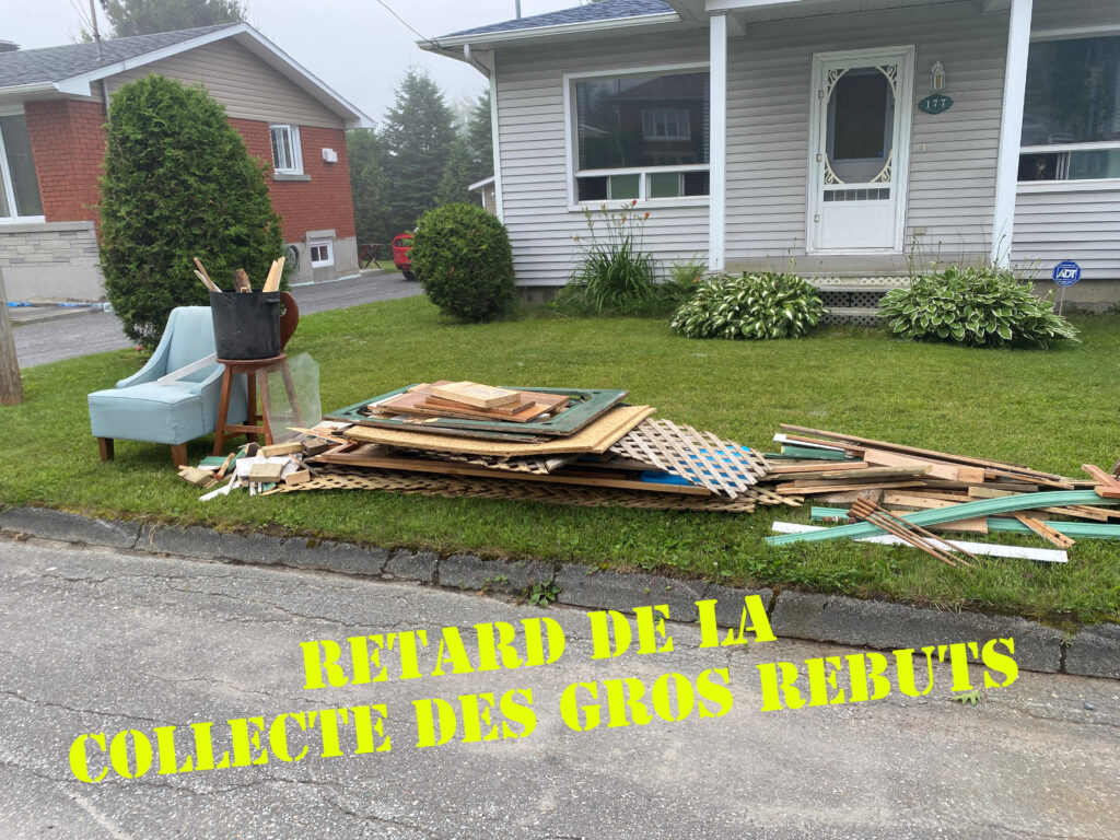 Prenez note du retard dans la collecte des gros rebuts dans toute la ville. D’ici là, profitez-en pour disposer des matières recyclables comme le carton dans votre bac de récupération. Des matières comme le bois et le matériel électronique devrait être déposé à l’écocentre régional situé au 105, chemin du Maine Central à Bury. Les petites matières à jeter peuvent être déposées dans le bac d’ordures. Merci pour votre aide et votre compréhension.