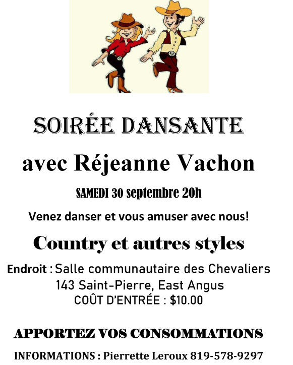 Soirée dansante avec Réjeanne Vachon ce samedi 30 septembre 2023 à 20 h à la Salle communautaire des Chevaliers