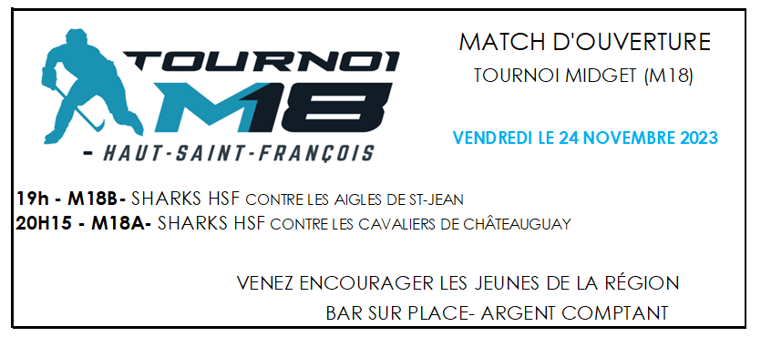 Le Tournoi M18 du Haut-Saint-François du 24 au 26 novembre 2023 à l’Aréna Robert-Fournier. L’horaire ici : https://www.publicationsports.com/stats/tournoi/tpmhsf/index.html