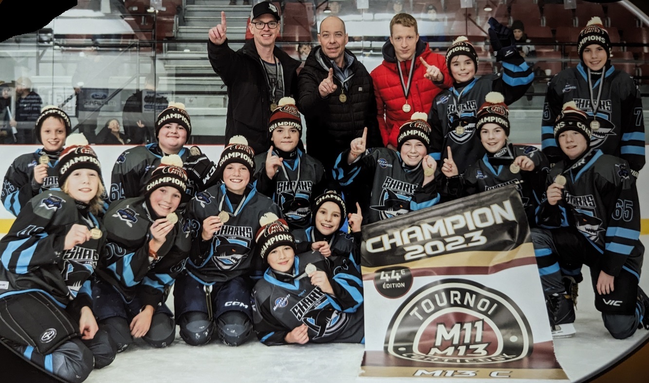 Les Sharks du Haut-Saint-François M13C sont champions au Tournoi M11-M13 de Coaticook 2023! Après deux défaites en ronde préliminaire vendredi et samedi, l’équipe de Stéphane Paré et des adjoints Yannick Cassidy et Jacques Isch s’est repris aujourd’hui dimanche 19 novembre en demi-finale en l’emportant 7-2 face au Phoenix de Sherbrooke (3) et l’a remporté en finale 2-1 face au Commandeurs de Pointe-Lévy. Félicitations à toute l’équipe!