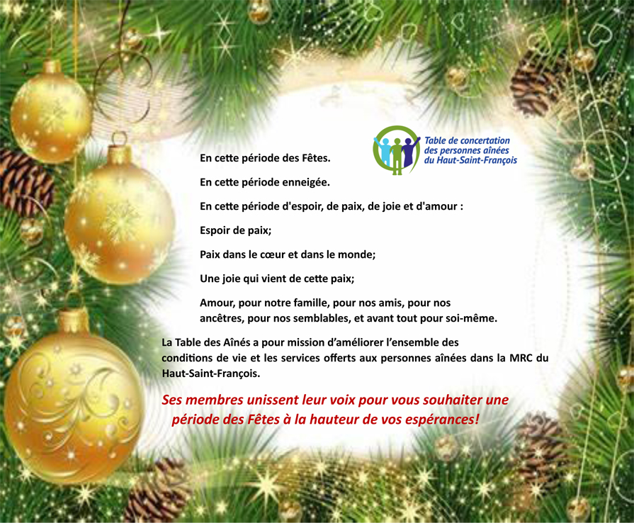 Joyeuses fêtes de la part de la Table de concertation des personnes aînées du Haut-Saint-François! Agrandir l'image East Angus2023-12-08T11:05:19-05:008 décembre 2023|Actualités| Partager sur les réseaux FacebookTwitterCourriel