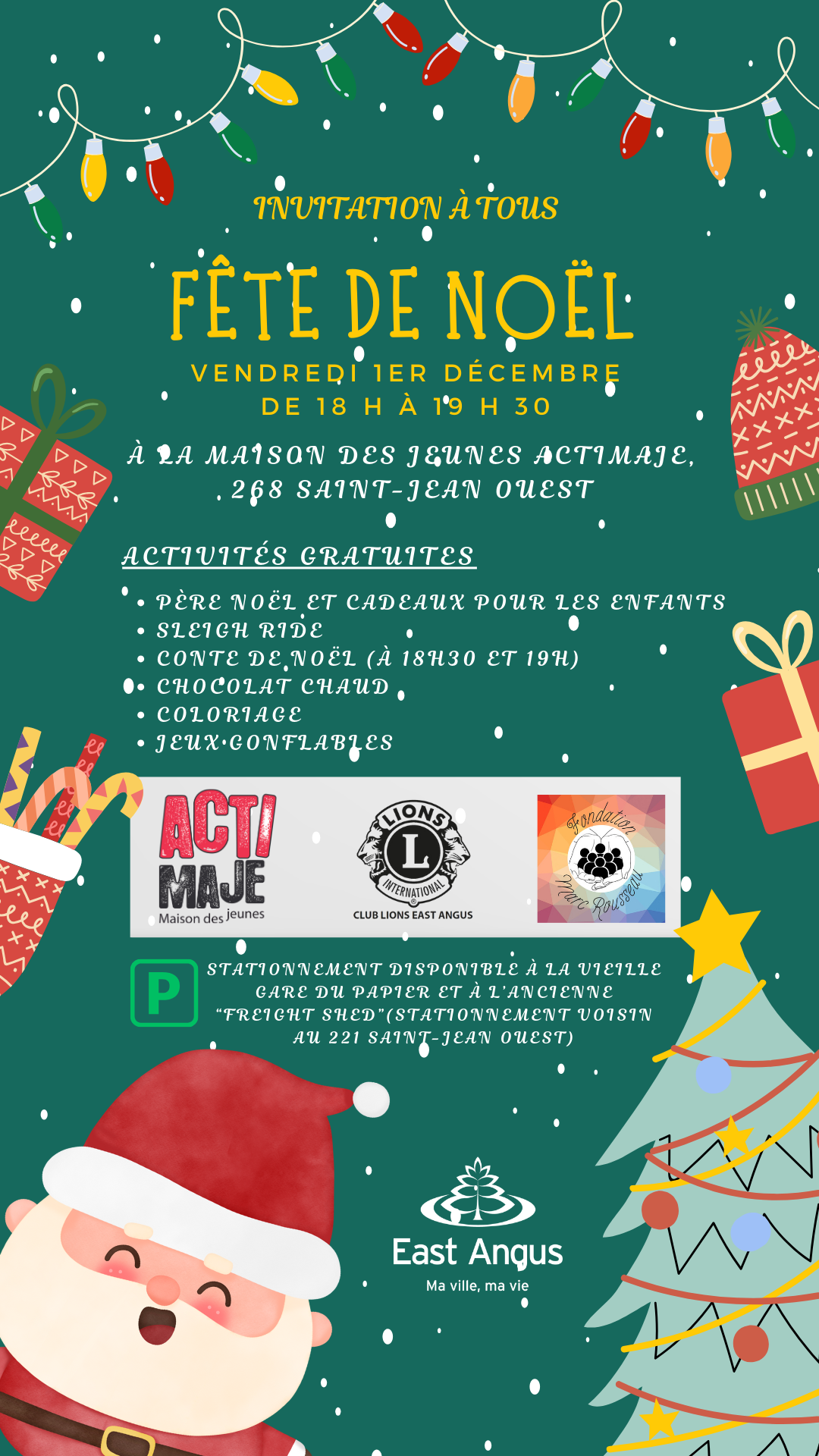Une invitation à la Fête de Noël qui se tiendra le vendredi 1er décembre de 18 h à 19 h 30 à la Maison des jeunes Actimaje au 268, rue Saint-Jean Ouest, East Angus. C’est gratuit! Bienvenue à tous! Une activité de la Ville de East Angus en collaboration avec la Maison des jeunes Actimaje, le Club Lions de East Angus et la Fondation Marc Rousseau!