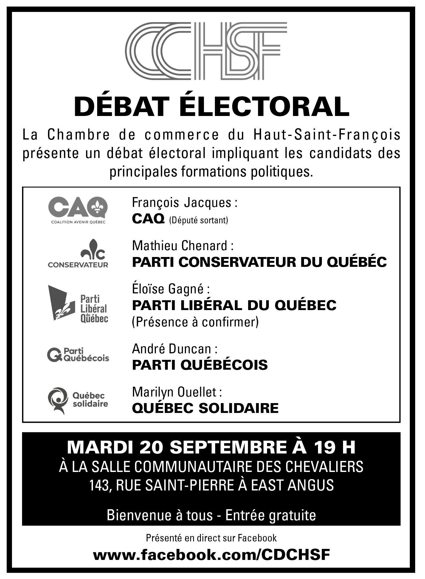 La Chambre de commerces du Haut-Saint-François présente un débat électoral impliquant les candidats des principales formations politiques.