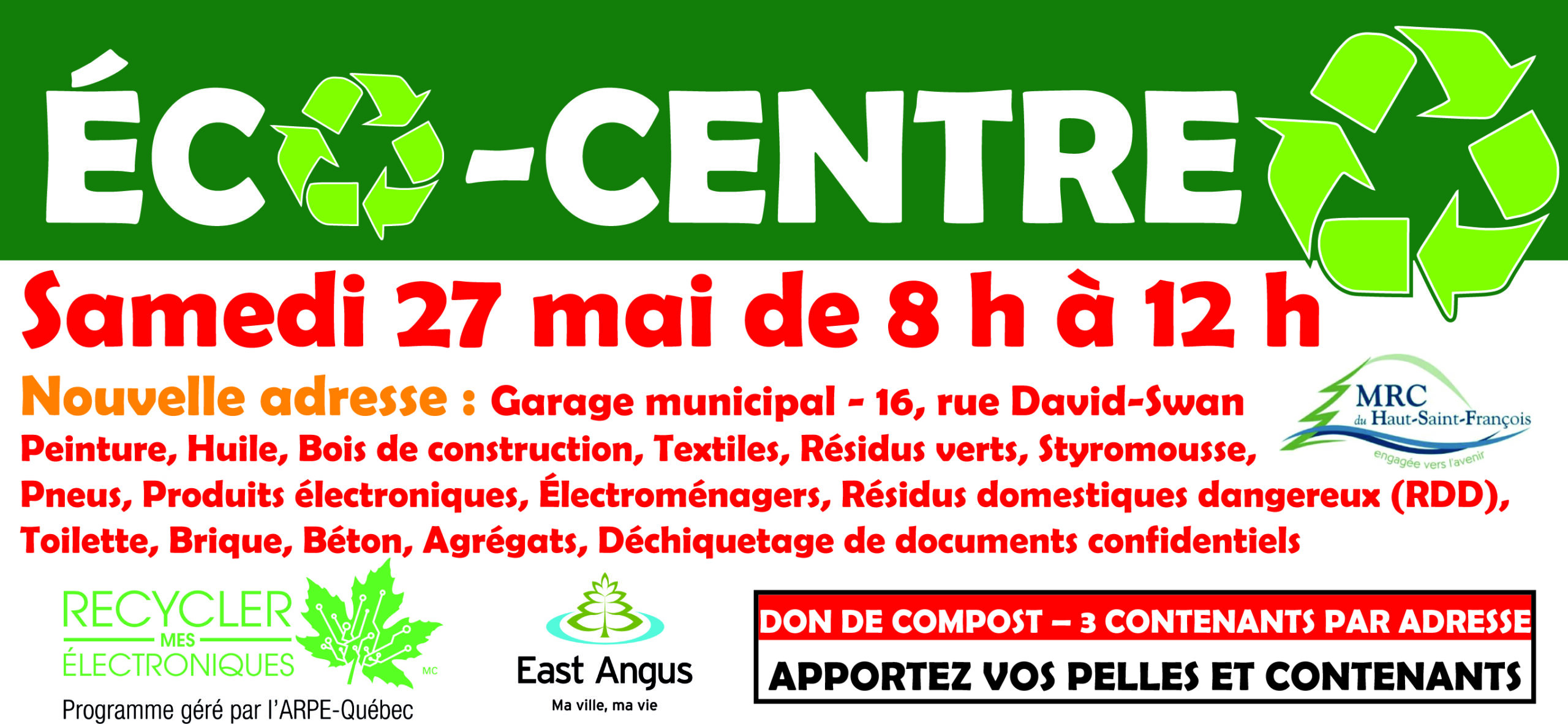 Éco-centre mobile Nouveau lieu en 2023 – Garage municipal au 16, rue David-Swan.