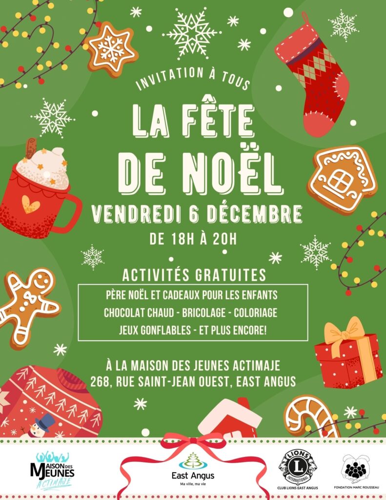 Vendredi 6 décembre 2024 de 18 h à 19 h 30 à la Maison des jeunes Actimaje au 268, rue Saint-Jean Ouest, East Angus