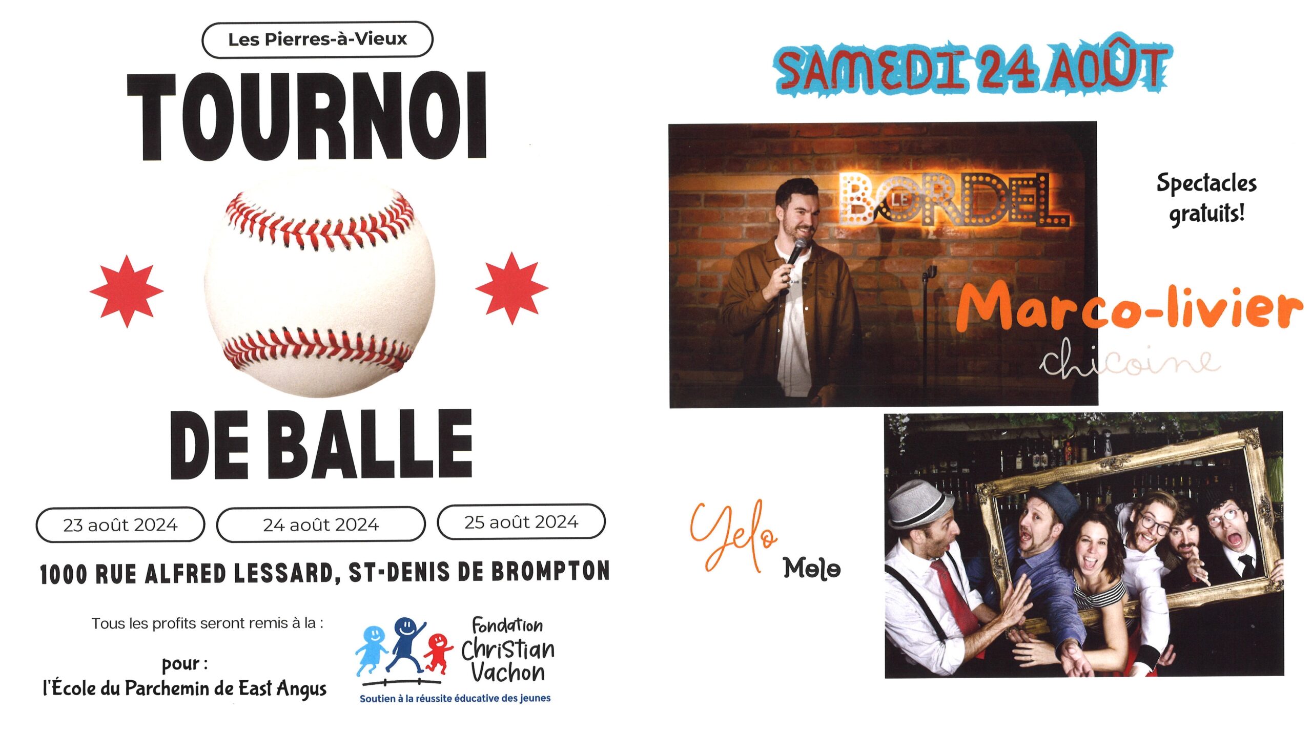 Toute la population est invitée au tournoi de balle et aux spectacles gratuits offerts le 23, 24 et 25 août au profit de la Fondation Christian Vachon pour la clientèle de l’École du Parchemin (côté couvent et côté collège) de East Angus.