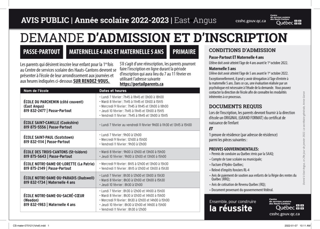 Période d’inscription du 7 au 11 février – Centre de services scolaire des Hauts-Cantons