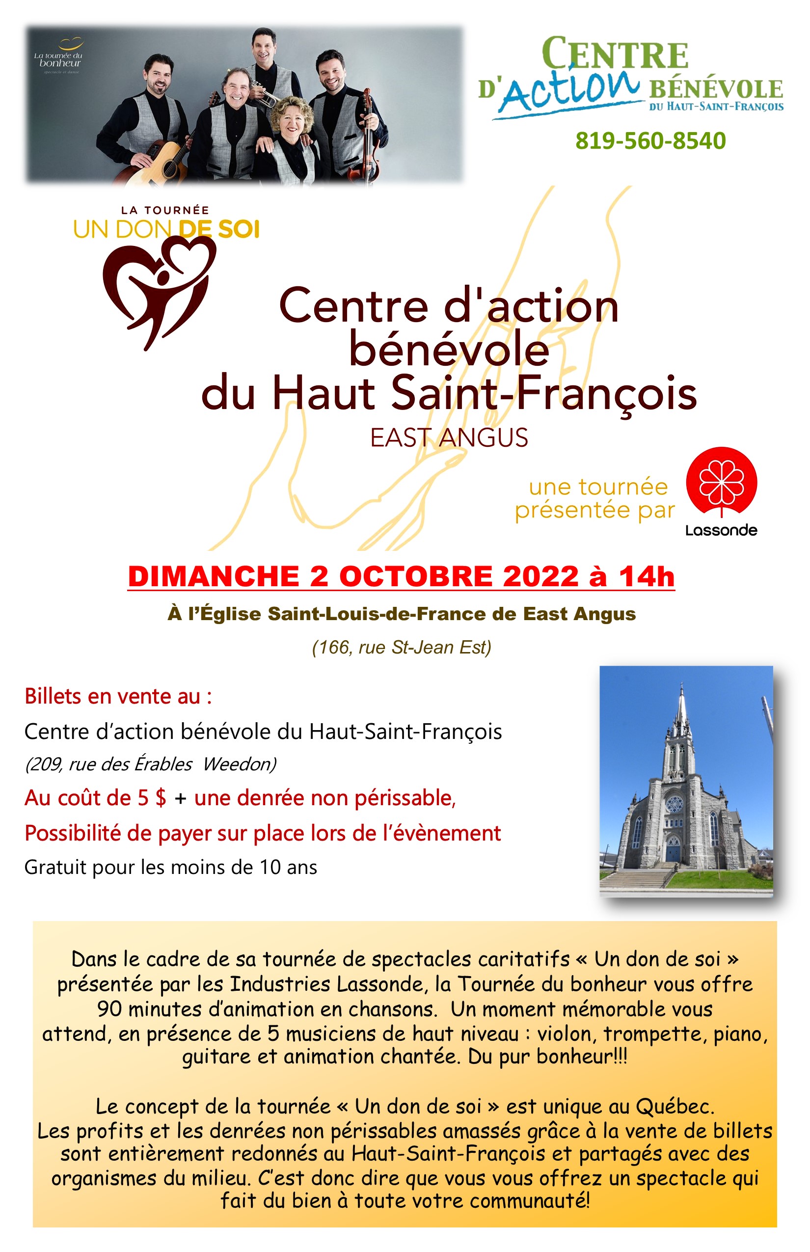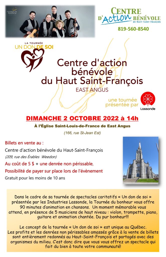 Le concept de la tournée « Un don de soi » est unique au Québec. Les profits et les denrées non périssables amassés grâce à la vente de billets sont entièrement redonnés au Haut-Saint-François et partagés avec des organismes du milieu. C’est donc dire que vous vous offrez un spectacle qui fait du bien à toute votre communauté!