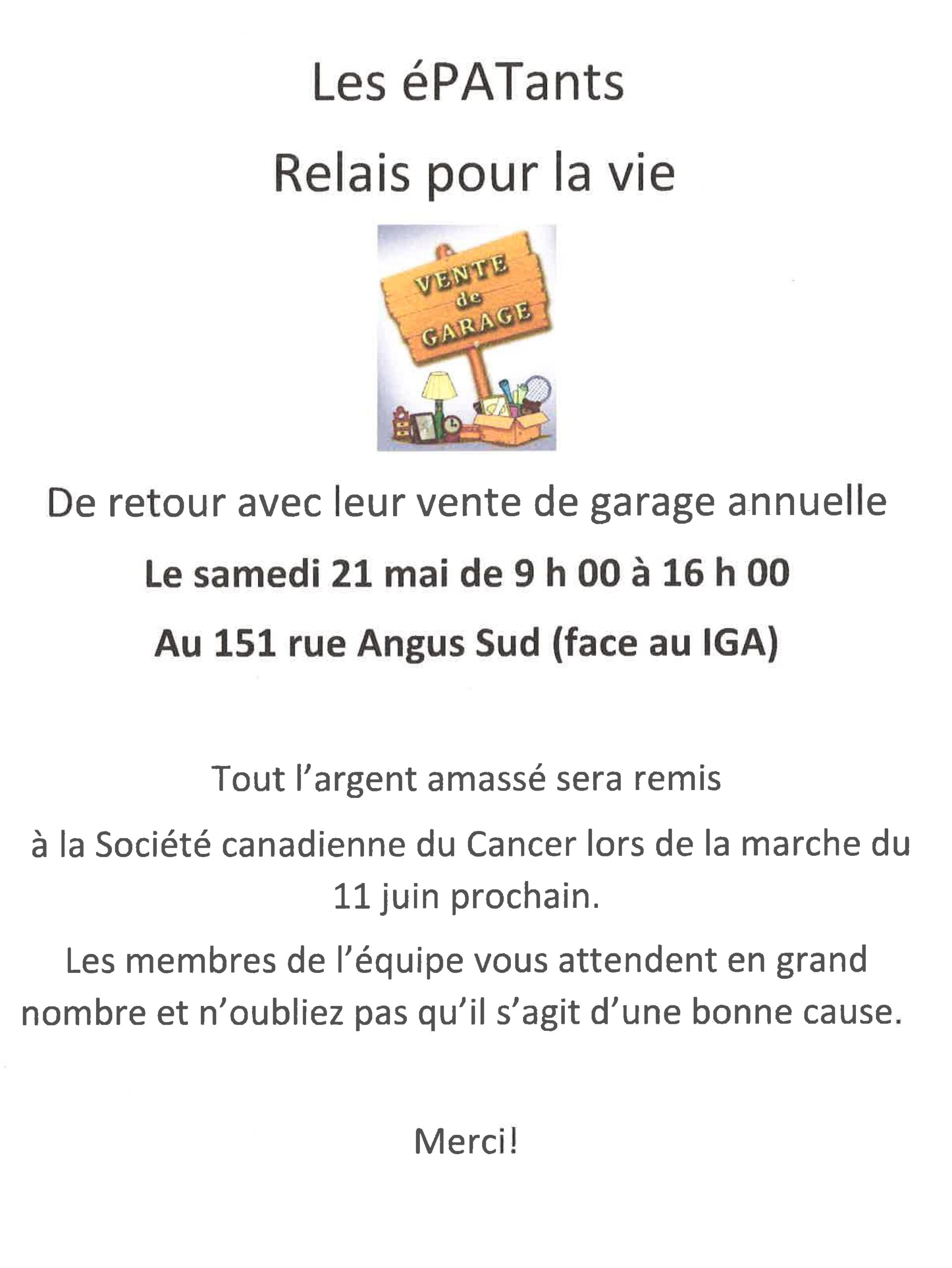 Les Épatants sont de retour avec leur vente de garage annuelle le samedi 21 mai de 9 h à 16 h au 151, rue Angus Sud devant le IGA.