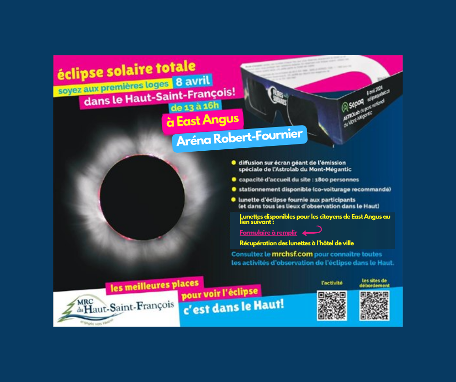 8 avril 2024 - 14 h 30 à 16 h 30 Éclipse totale dans le Haut! Aréna Robert-Fournier 190, rue Kennedy,East Angus,Québec,Canada