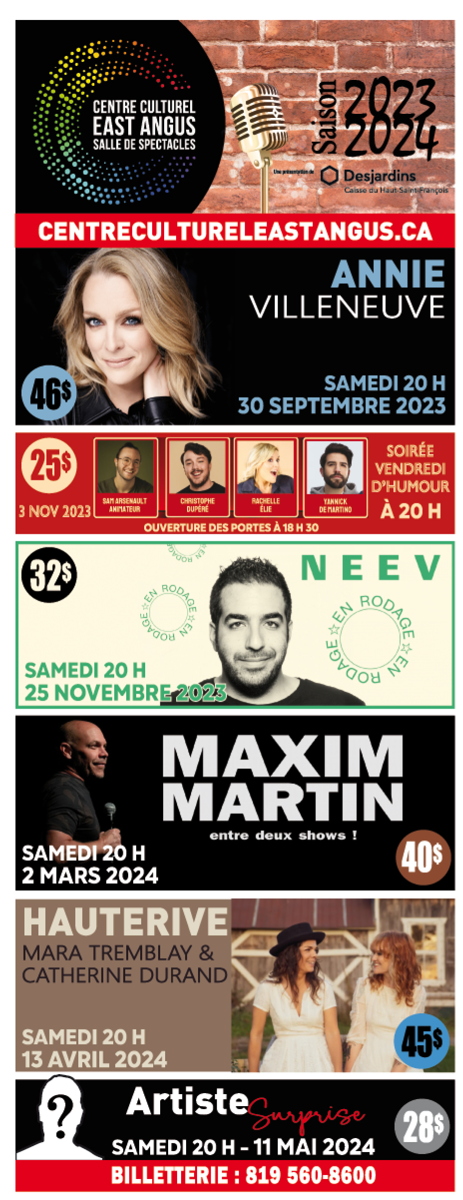 11 mai 2024 - 20 h 00 à 21 h 30 Artiste surprise au Centre culturel Centre culturel de East Angus 288, rue Maple,East Angus,Québec,Canada