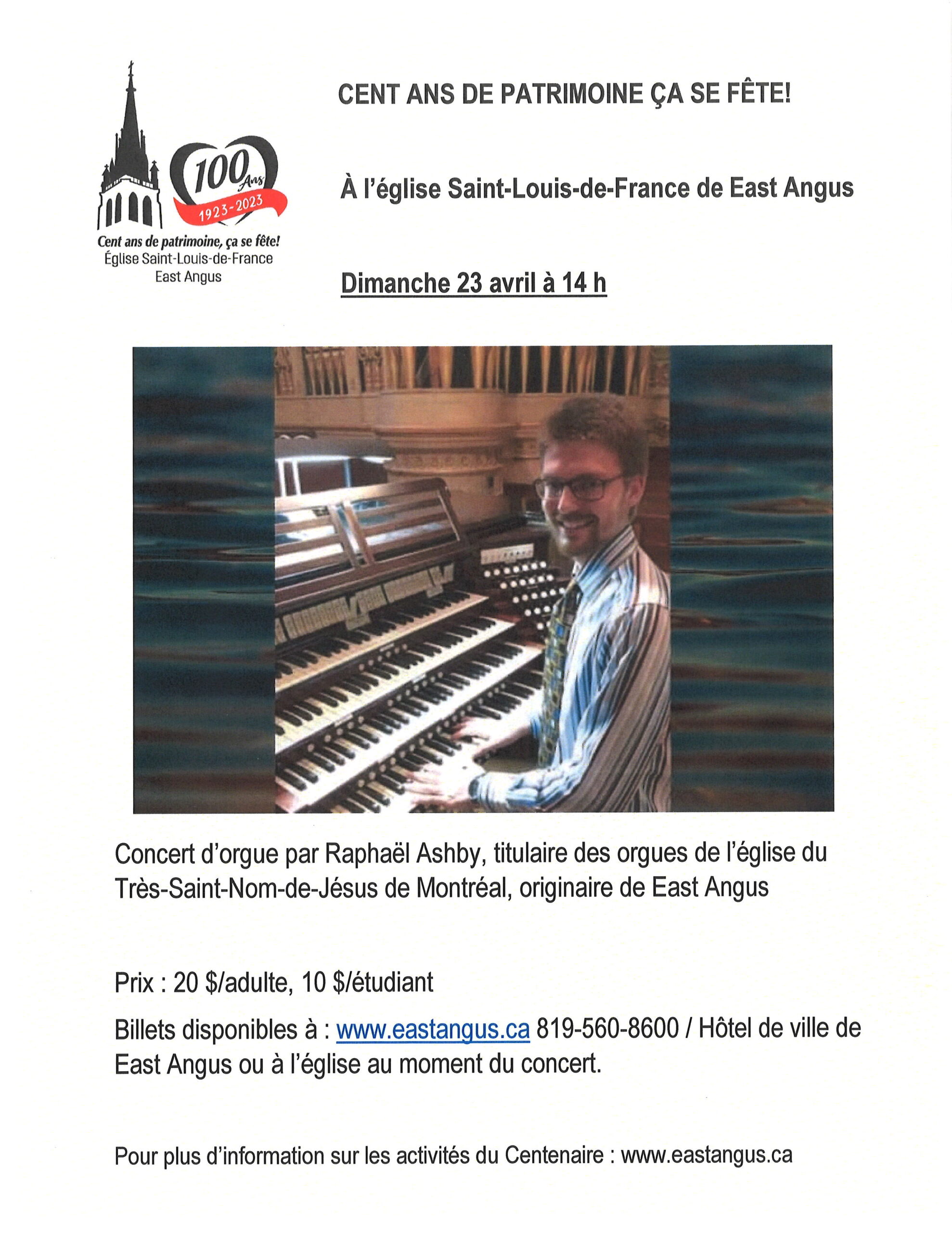 23 avril 2023 - 14 h 00 à 15 h 30 Spectacle de l’organiste Raphaël Ashby – Centenaire de l’Église Saint-Louis-de-France Église Saint-Louis-de-France 166, rue Saint-Jean Est,East Angus,Québec,Canada