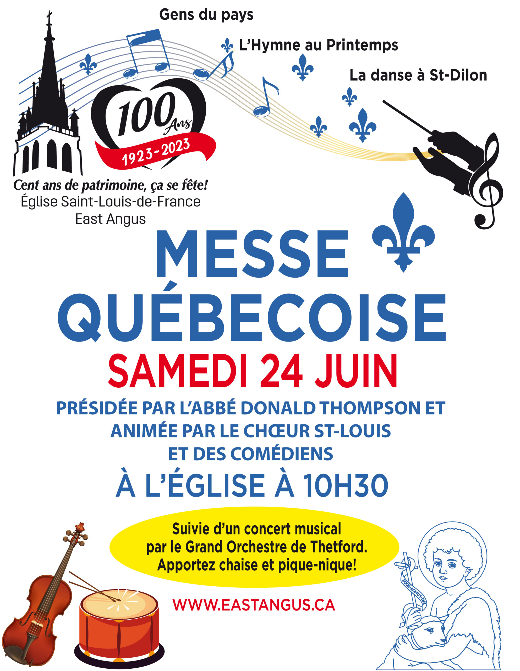 24 juin 2023 - 10 h 30 à 13 h 00 Messe Québécoise de la St-Jean – Centenaire de l’Église Saint-Louis-de-France Église Saint-Louis-de-France 166, rue Saint-Jean Est,East Angus,Québec,Canada