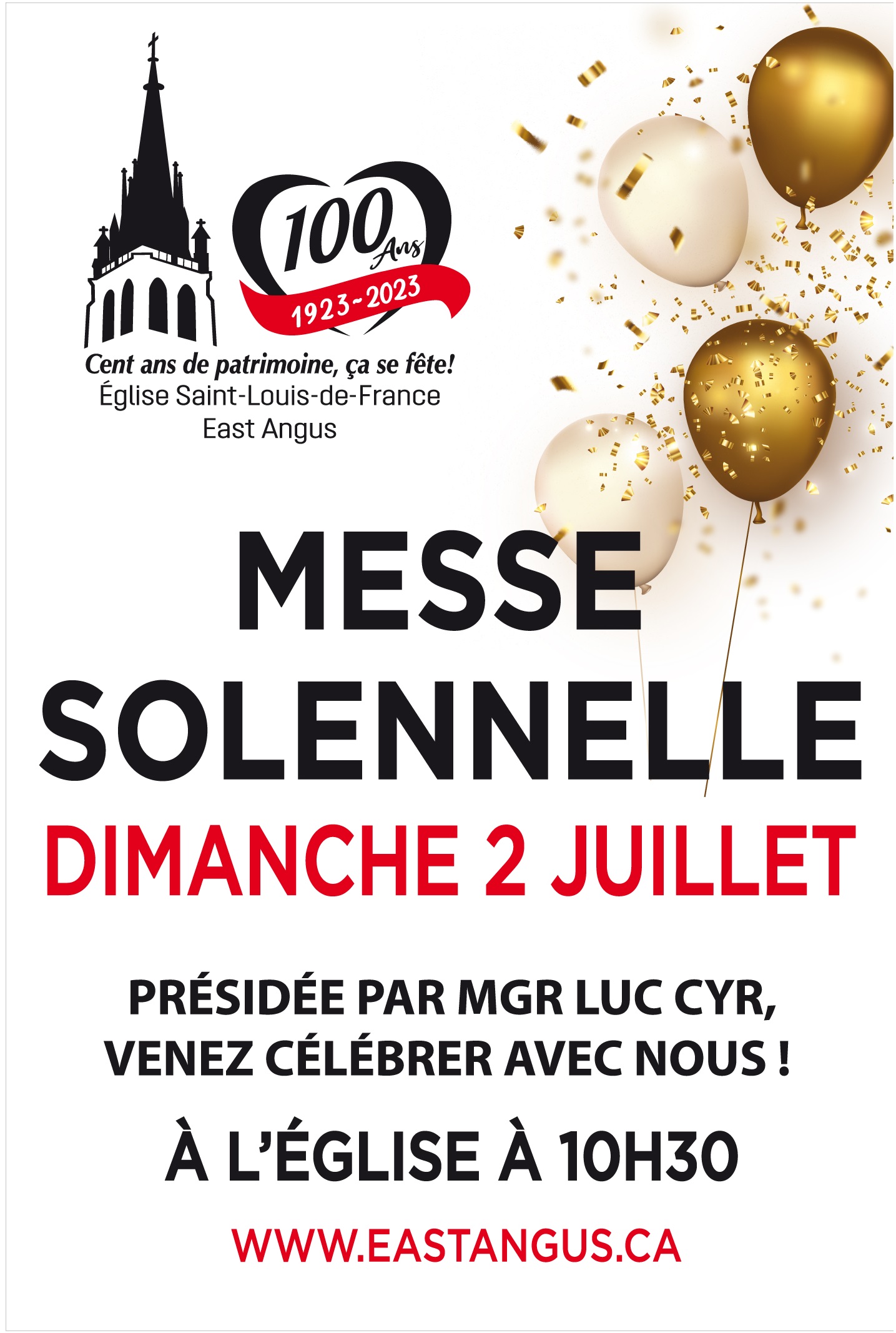 2 juillet 2023 - 10 h 30 à 12 h 00 Messe solennelle du centenaire – Centenaire de l’Église Saint-Louis-de-France Église Saint-Louis-de-France 166, rue Saint-Jean Est,East Angus,Québec,Canada