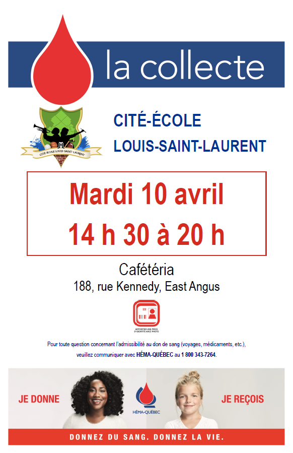 C’est demain qu’aura lieu la prochaine collecte de sang de la Cité-école Louis-Saint-Laurent. Venez en grand nombre donner du sang entre 14 h 30 et 20 h à la cafétéria de l’école. Parce qu’en donnant du sang, on donne la vie…