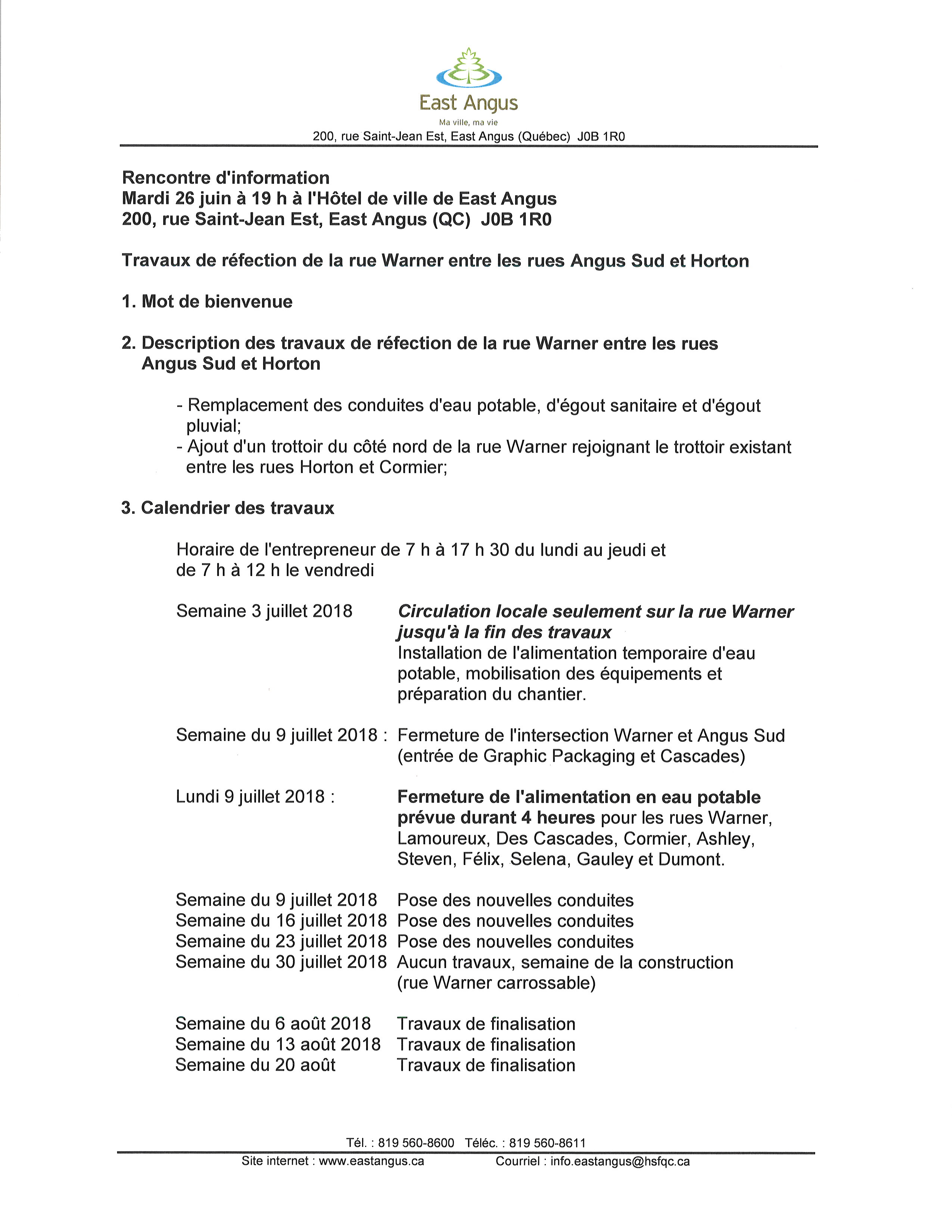 Petit changement de date pour l’entrave sur la rue Warner qui sera en place dès demain, le 29 juin, au lieu du 3 juillet. Nous aurons des travaux qui débuterons demain pour la pulvérisation et l’installation du réseau temporaire.