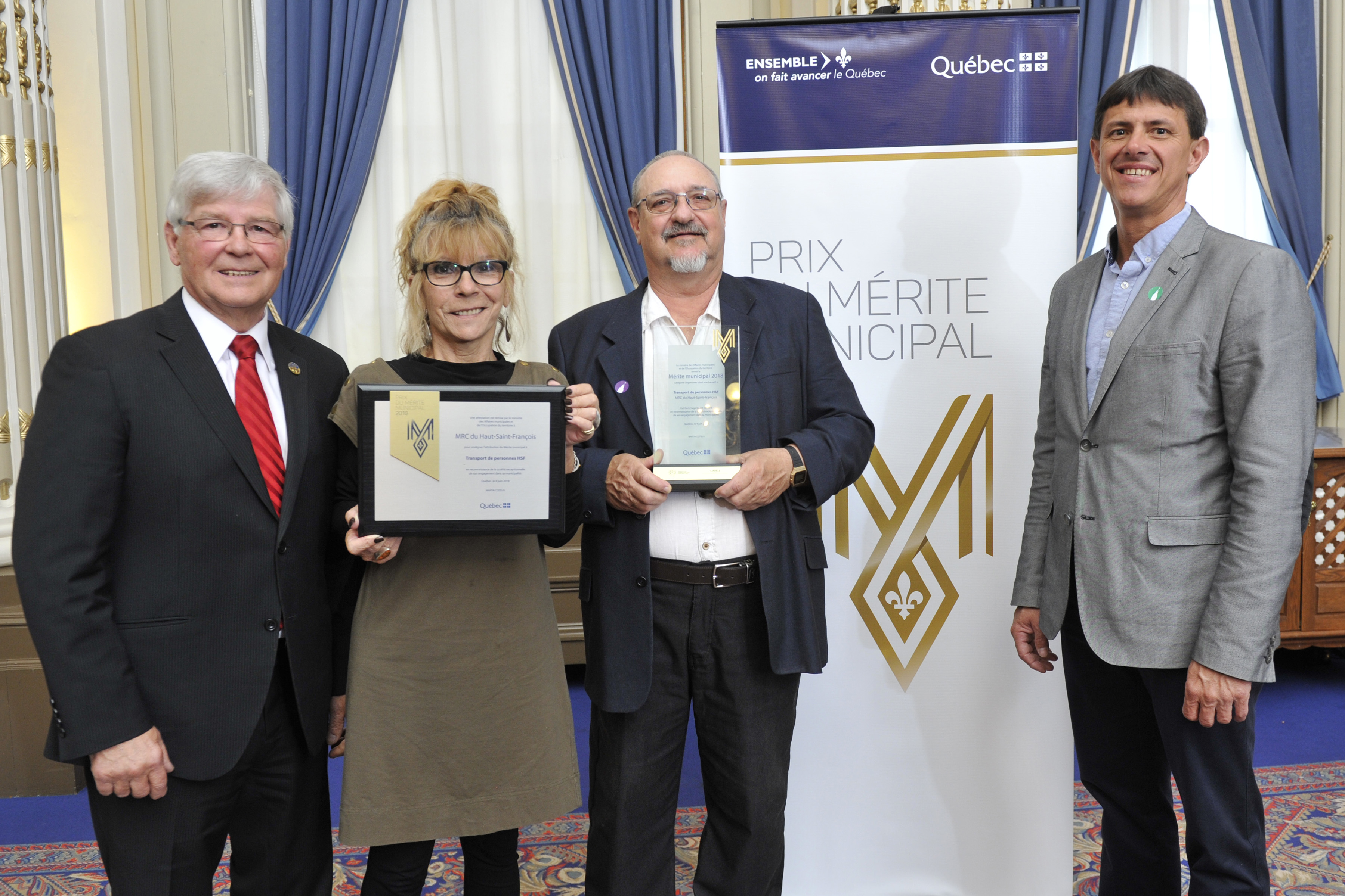 Thérèse Domingue, directrice de Transport de personnes HSF explique : «L’approche de Transport de personnes HSF est de proposer l’accès universel aux utilisateurs et utilisatrices de la majorité des circuits. Ainsi, l’organisme à but non lucratif et la MRC remportent le pari de mettre un terme non seulement au clivage entre les clientèles du transport collectif et du transport adapté, mais aussi aux préjugés face à certains profils d’utilisateurs et d’utilisatrices.» La remise du prix a eu lieu le 4 juin au restaurant «Le parlementaire» au parlement à Québec. Thérèse Domingue et Guy Lapointe, président du conseil d’administration de Transport de personnes HSF, étaient sur place pour accepter le trophée des mains du député de Côte-du-Sud et whip adjoint du gouvernement, Norbert Morin. Une plaque était également remise à la MRC du Haut-Saint-François, représentée par son préfet, Robert G. Roy.