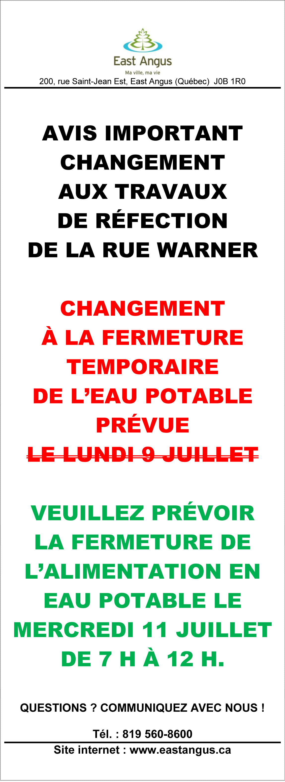 Fermeture de l’alimentation en eau potable : mercredi 11 juillet de 7 h à 12 h. Les citoyens de la rue Horton ne devraient pas être touchés par cette fermeture.