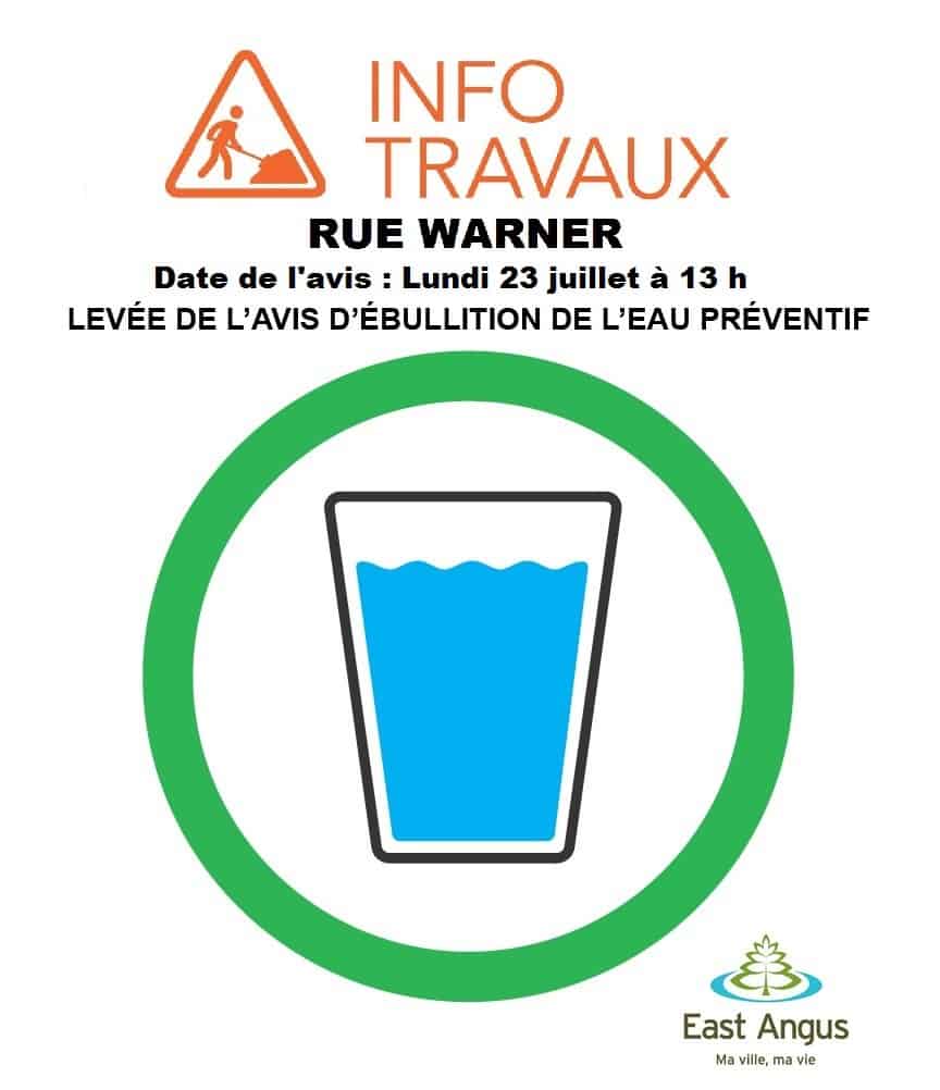 Travaux rue Warner – Levée de l'avis d'ébullition Agrandir l'image East Angus, lundi 23 juillet à 13 h Levée de l’avis d’ébullition de l’eau préventif. Les citoyennes et les citoyens de ce secteur peuvent recommencer à consommer l’eau sans la faire bouillir. East Angus2020-03-11T14:34:11-04:0023 juillet 2018|Nouvelles| Partager sur les réseaux FacebookTwitterCourriel