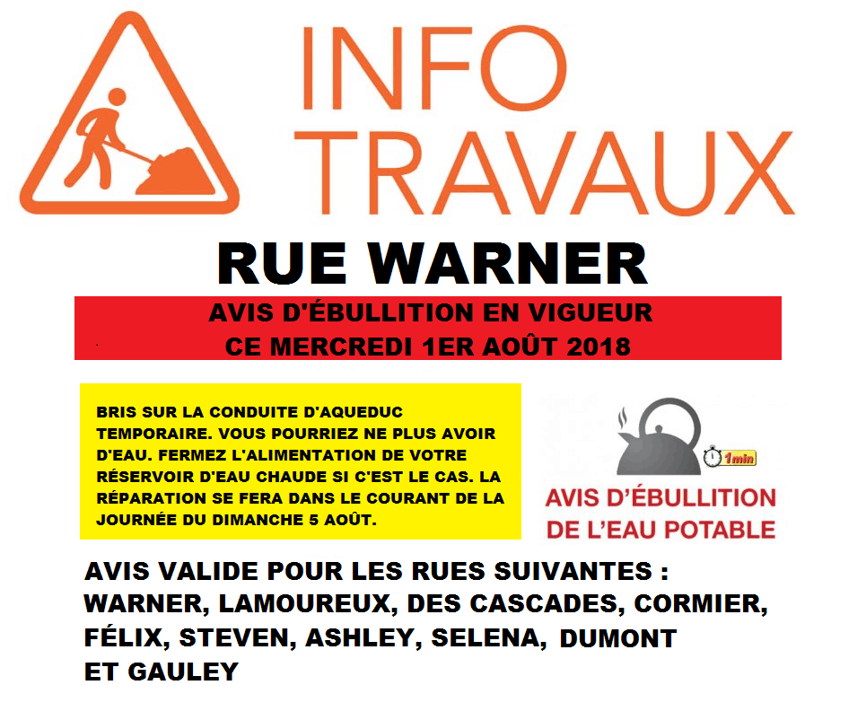 BRIS SUR LA CONDUITE D’AQUEDUC TEMPORAIRE. VOUS POURRIEZ NE PLUS AVOIR D’EAU. FERMEZ L’ALIMENTATION ÉLECTRIQUE DE VOTRE RÉSERVOIR D’EAU CHAUDE SI C’EST LE CAS.