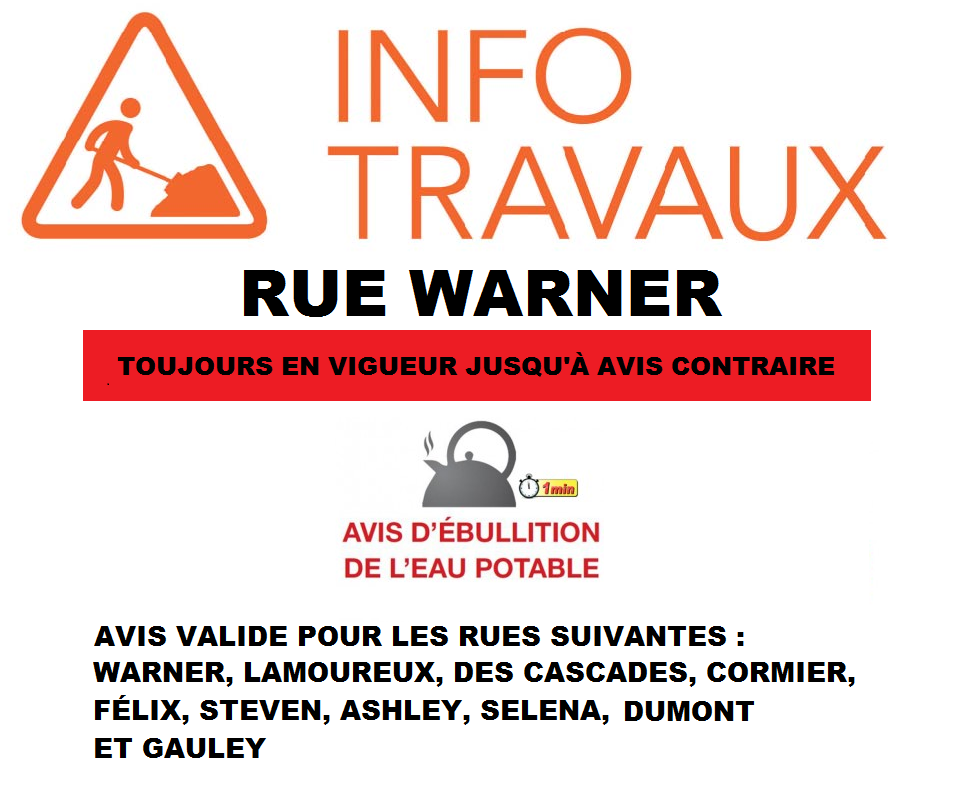 L’avis d’ébullition reste en vigueur pour les rues Warner, Lamoureux, Des Cascades, Gauley, Dumont, Cormier, Steven, Ashley, Selena et Félix.