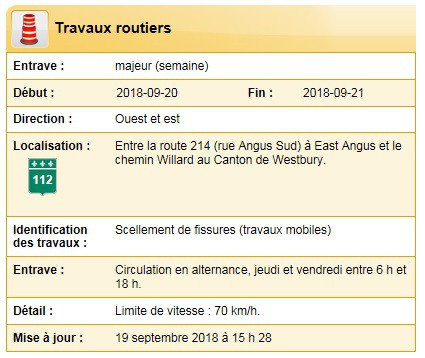 Avis d'entrave – R-112 – East Angus et Canton de Westbury – scellement de fissures (travaux mobiles) Agrandir l'image Avis d’entrave R-112 – East Angus et Canton de Westbury – scellement de fissures (travaux mobiles) Message de la part du Ministère des Transports East Angus2020-03-11T14:31:32-04:0019 septembre 2018|Nouvelles| Partager sur les réseaux FacebookTwitterCourriel