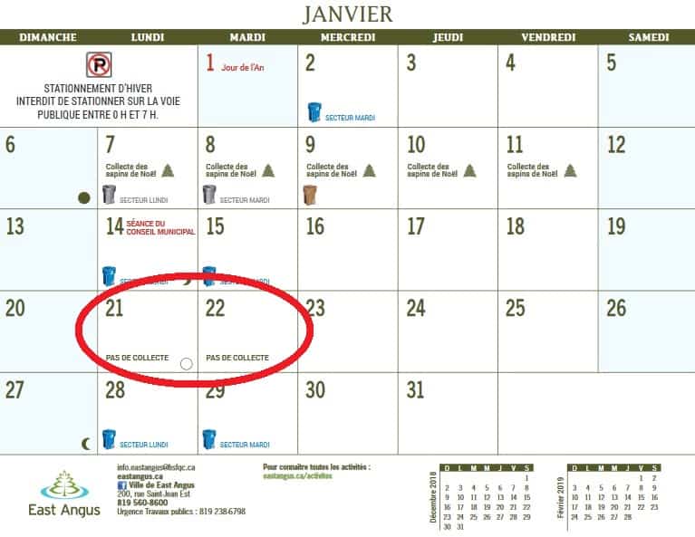 Tel qu’indiqué au calendrier municipal distribué en décembre 2018, aucune collecte n’est prévu cette semaine du 21 janvier.