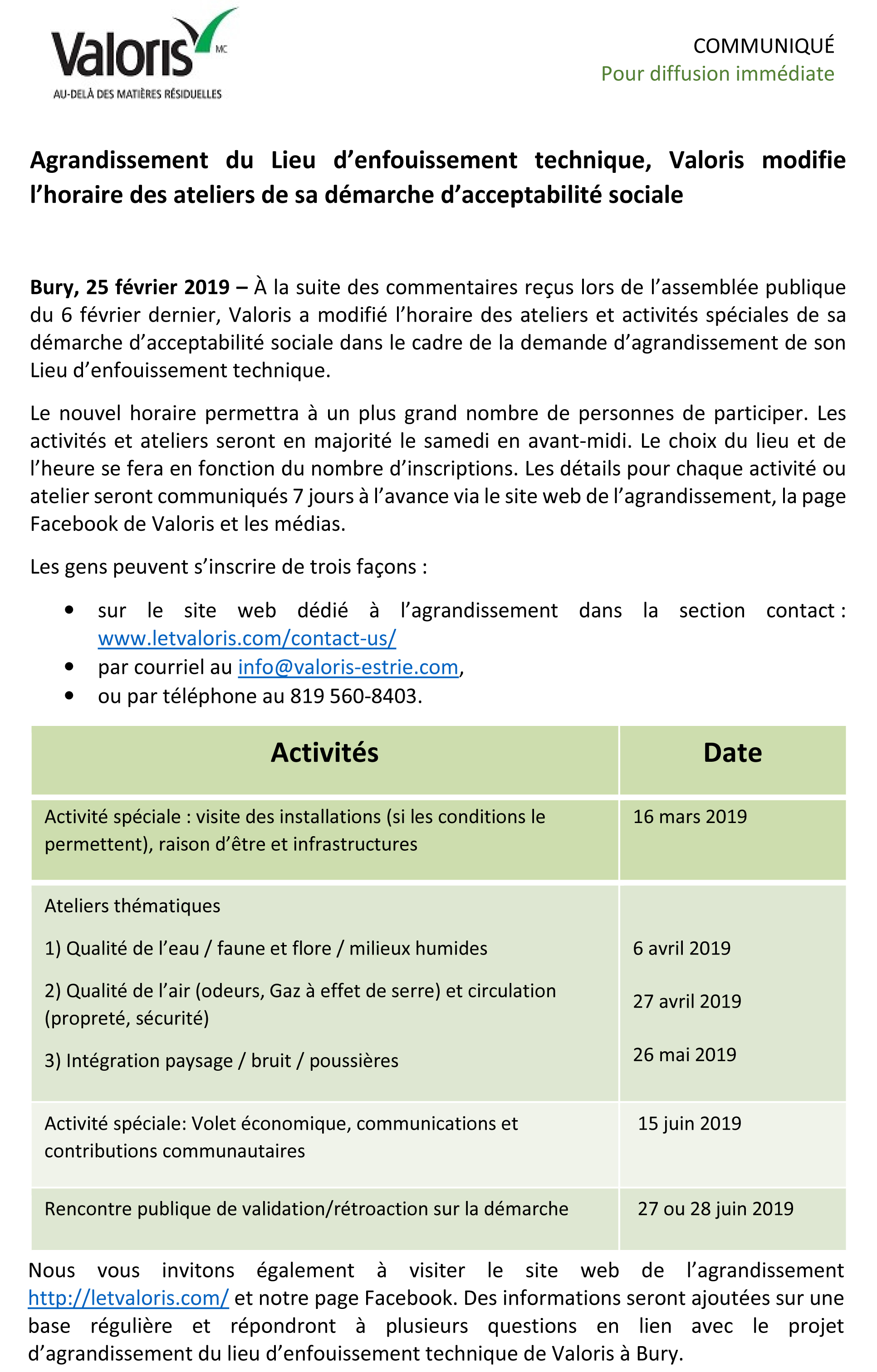 Bury, 25 février 2019 – À la suite des commentaires reçus lors de l’assemblée publique du 6 février dernier, Valoris a modifié l’horaire des ateliers et activités spéciales de sa démarche d’acceptabilité sociale dans le cadre de la demande d’agrandissement de son Lieu d’enfouissement technique.