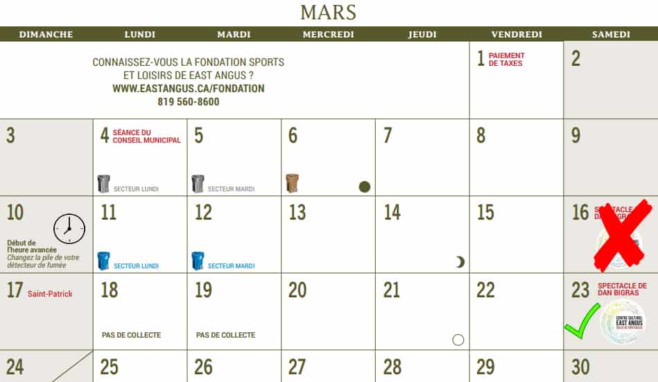 Une erreur c’était glissée au calendrier municipal 2019 pour le mois de mars. Le spectacle de Dan Bigras au Centre culturel de East Angus était inscrit le samedi 16 mars et c’est plutôt ce samedi 23 mars à 20 h (ouverture des portes à 19 h). Tous les billets sont vendus.